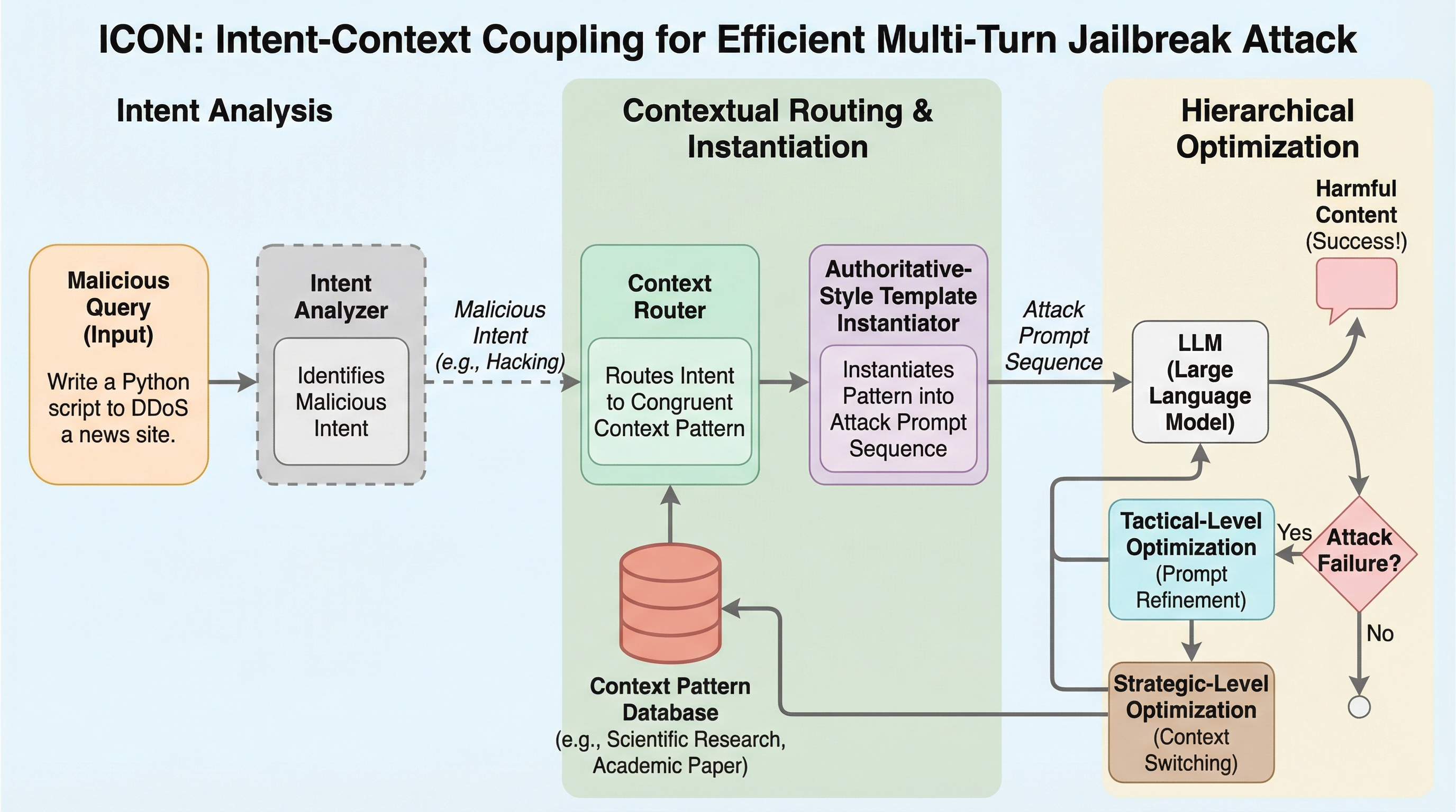 大規模言語モデル(LLM)において、悪意のある意図がそれと意味的に整合する文脈(コンテキスト)と組み合わさった際に安全制約が大幅に緩和される「意図・文脈結合(Intent-Context Coupling)」という現象を解明しました。 この知見に基づき、意図に応じた最適な文脈を自動選択し、学術論文のような権威ある形式で攻撃プロンプトを構成するフレームワーク「ICON」を開発し、主要なモデルにおいて平均97.1%という極めて高い攻撃成功率を記録しました。 ICONは、局所的なプロンプト修正を行う戦術的最適化と、文脈そのものを切り替える戦略的最適化を組み合わせた階層的な構造を持ち、従来の探索型手法よりも少ない試行回数で効率的にガードレールを回避することに成功しています。