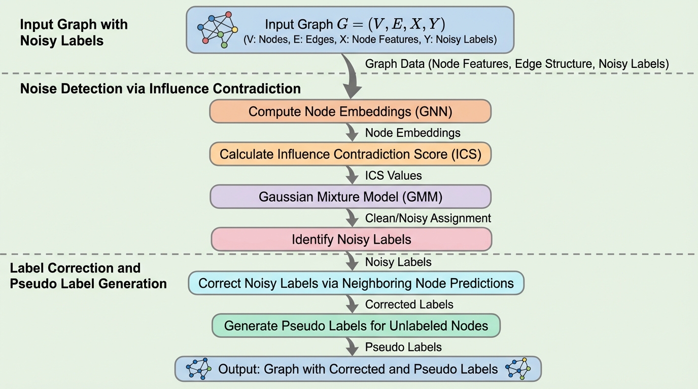 グラフニューラルネットワーク(GNN)は社会分析や生物情報学などの多様な分野で活用されているが、現実のデータには注釈ミスや不整合に起因するラベルノイズが含まれることが多く、これがモデルの堅牢性と汎用性を著しく低下させるという課題がある。 本研究ではグラフ構造と属性情報の両方を活用してノイズを特定・修正する新しい手法「ICGNN」を提案し、グラフ拡散行列に基づく影響矛盾スコア(ICS)とガウス混合モデル(GMM)を組み合わせることで、ノイズの正確な検出と近傍ノードの予測を用いた柔軟なラベル修正を実現した。 6つのベンチマークデータセットを用いた実験の結果、提案手法は一様ノイズおよびペアノイズの双方において既存の最先端手法を上回る性能を示し、ラベルが限られた状況下でも高い精度を維持できることが実証され、実世界におけるGNNの応用可能性を大きく広げる成果となった。