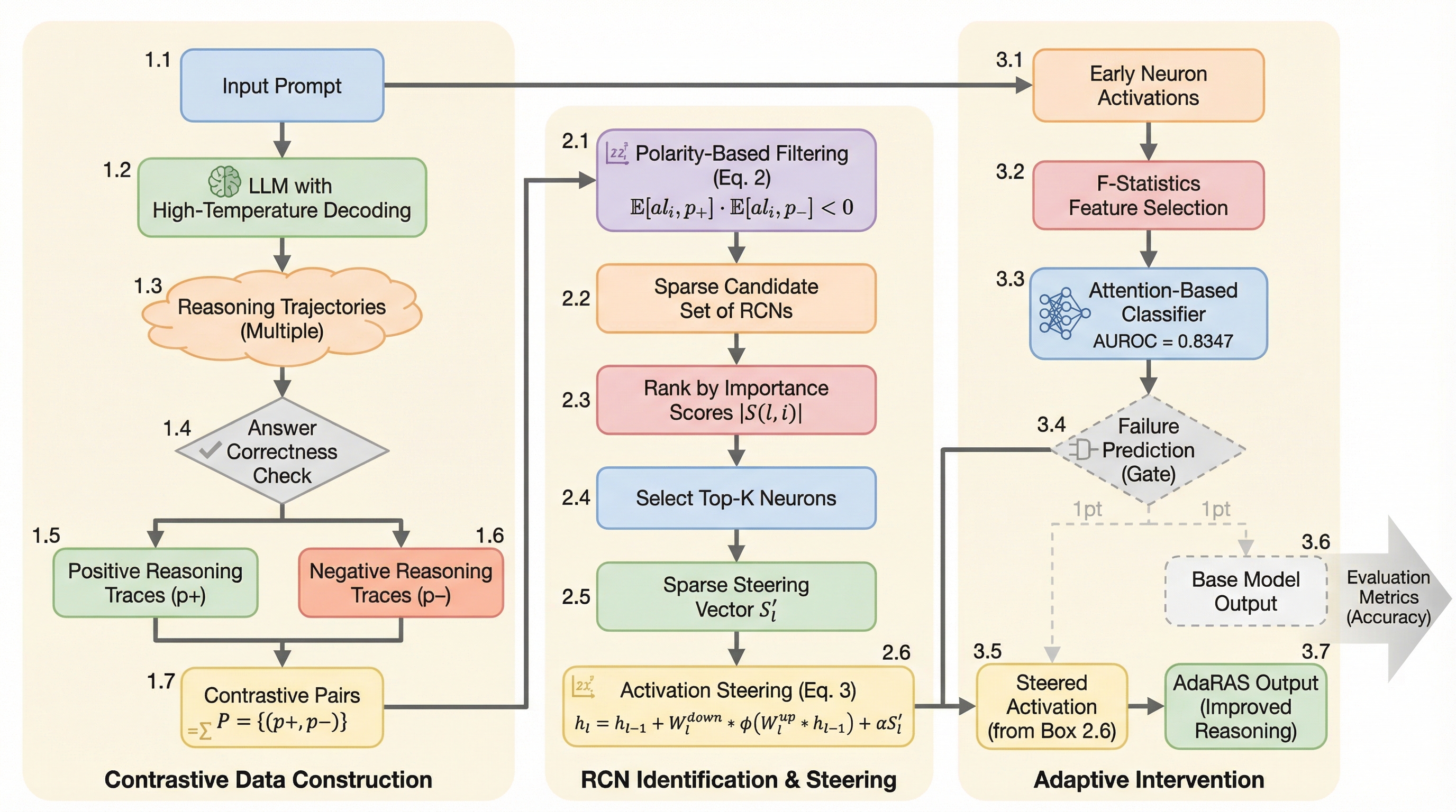 大規模言語モデル(LLM)の内部には、推論の正誤と強く相関する「推論重要ニューロン(RCN)」が少数存在することを発見し、これを利用した軽量な介入フレームワーク「AdaRAS」を提案しました。 この手法は、正解と不正解の推論軌跡における活性化パターンの差からRCNを特定し、推論の失敗が予測される場合にのみ適応的にニューロンの活性化を調整することで、追加学習なしで推論の信頼性を向上させます。 数学やコード生成の10個のベンチマークで一貫した性能向上を確認し、特に難易度の高いAIME-24およびAIME-25では13%以上の精度向上を達成するとともに、異なるデータセットやモデル間での高い転移性も示しました。