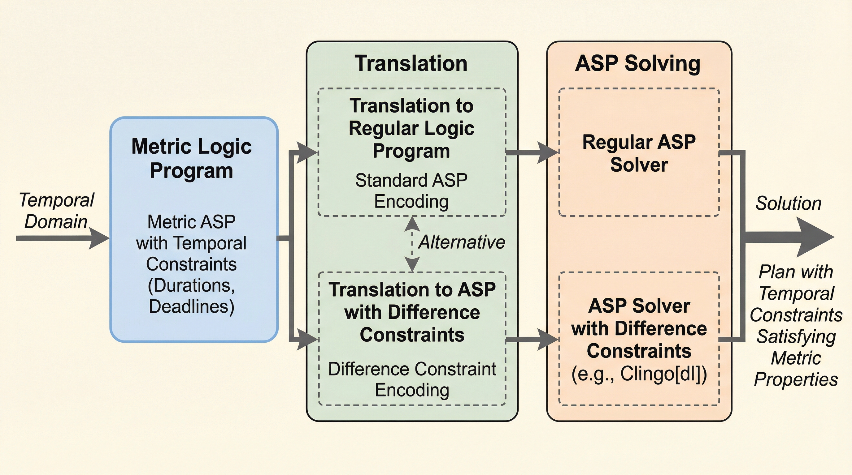 本研究の核心的な提案は、メトリックASPを「差分制約(difference constraints)」と呼ばれる形式と組み合わせることで、時間に関連する数値処理を論理エンジンの外部で処理する手法です。これにより、メトリック論理プログラムの論理構造を時間の粒度から完全に切り離す(デカップリングする)ことに成功しました。具体的には、メトリック論理プログラムを、既存のソルバーで処理可能な形式に変換するための二つの主要な翻訳手法を提案しています。 第一の翻訳手法は、時間をブール原子として表現する標準的なアプローチです。これは理解しやすい一方で、時間の範囲や精度に応じてプログラムの規模が拡大するという従来の欠点を抱えています。これに対し、本研究の主要な貢献である第二の翻訳手法は、整数変数と差分制約を利用して時間を直接表現します。…