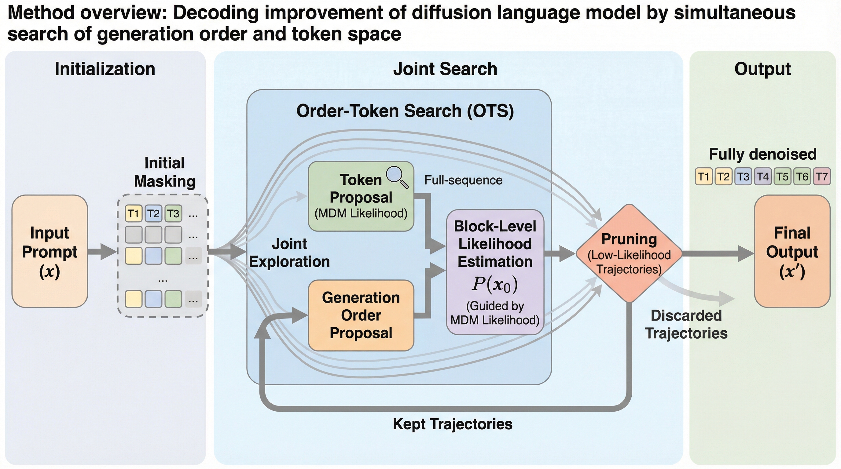 拡散言語モデル(DLM)が持つ「生成順序に依存しない」という潜在的な利点を引き出すため、生成順序とトークンの値を同時に探索する新しいアルゴリズム「Order-Token Search」が提案されました。 この手法は、デノイジングの過程で複数の候補(ビーム)を保持し、独自の尤度推定器を用いて有望な軌跡を効率的に絞り込むことで、従来の単一の軌跡に依存するデコーディング手法の限界を打破しています。 数学的推論やコード生成のベンチマークにおいて、追加学習なしで従来の最高水準を大幅に上回る精度を達成し、事後学習(diffu-GRPO)を行ったモデルに匹敵、あるいはそれを超える性能を示しました。