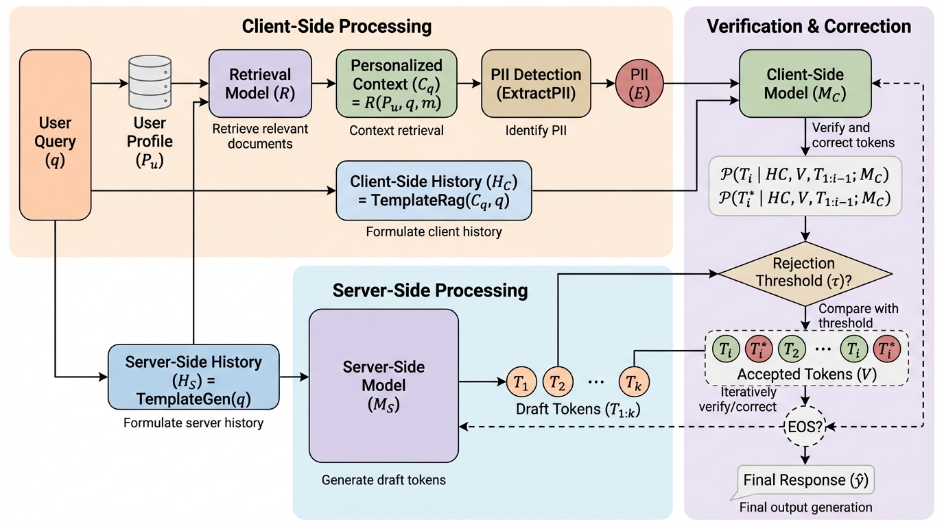 現代の情報アクセスシステムにおいて、パーソナライズは検索エンジン、推薦システム、質問回答システムの性能を向上させるために不可欠な要素となっています。ユーザー個別の好みや過去の対話履歴、背景知識に合わせて回答を調整することで、曖昧な質問の意図を明確にし、適切な事実を選択し、詳細度や口調を制御することが可能になります。現在、大規模言語モデルをパーソナライズするための最も効果的な手法は検索拡張生成(RAG)ですが、これには重大なプライバシー上の課題が伴います。RAGを利用するためには、ユーザーのプロフィールから抽出された関連情報をモデルに提供する必要がありますが、これをクラウド上のサーバーで行う場合、機密性の高い個人データがサービス提供者に公開されてしまいます。 一方で、プライバシーを完全に保護するためにユーザーのデバイス上で動作するローカルモデルのみを使用すると、計算資源やメモリの制約からモデルの規模を小さくせざるを得ず、サーバー側の高性能なモデルと比較して回答の質が著しく低下するという問題が生じます。…