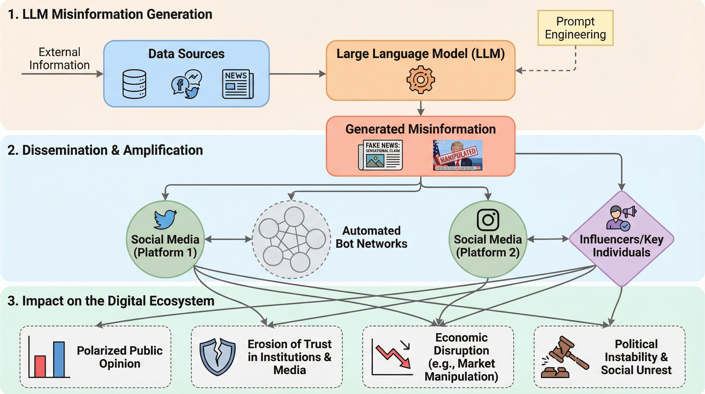 デジタルエコシステムは、プラットフォーム、ユーザー、アルゴリズム、そしてコンテンツが相互に連結された複雑なネットワークであり、現代社会における情報流通の主要なインフラとして機能している。このエコシステムの健全性は、そこを循環する情報の信頼性に全面的に依存しているが、誤情報が拡散することで、特定のコンテンツの真偽だけでなく、情報インフラそのものへの信頼が根本から損なわれる危険性がある。生成AIの急速な進歩により、人間が書いた文章と見分けがつかないほど説得力のあるテキストを大規模かつ低コストで生成することが可能になり、これを「産業化された欺瞞」と定義する。2024年の調査以降、大規模言語モデル(LLM)はさらに洗練され、GPT-4o、Claude 3.5、Gemini 1.5といった最新モデルが登場したことで、テキストのみならず画像、音声、ビデオを高度に組み合わせたマルチモーダルな誤情報が容易に作成できるようになった。これにより、従来の単一のメディア形式のみを対象とした検出手法では対応が極めて困難な状況が生じている。…