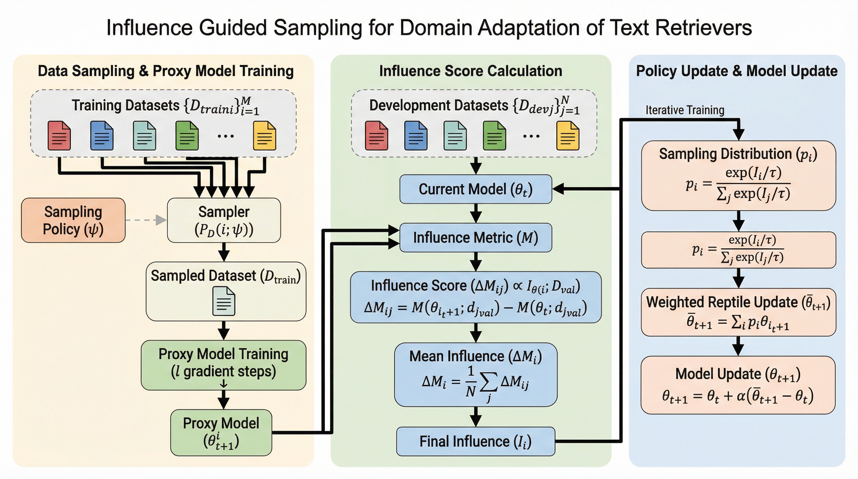 検索モデルの学習において、膨大で多様なデータセットから最適な訓練データを抽出する戦略は極めて重要ですが、従来の均等サンプリングや専門家の手動設定、あるいは勾配ベースの動的手法には、計算コストの増大や学習の不安定さという課題がありました。 本研究が提案する「Inf-DDS」は、強化学習の枠組みを用いてターゲットドメインに対する各データの「影響度」を報酬として算出し、サンプリングの重みを動的に最適化することで、既存手法よりも安定した学習と高い検索性能を実現する新しいフレームワークです。 実証実験の結果、Inf-DDSは多言語モデルbge-m3においてNDCG@10を5.03ポイント向上させ、さらに既存の勾配ベース手法と比較してGPUの計算コストを1.5倍から4倍削減することに成功しており、効率的かつ効果的なドメイン適応が可能であることを示しました。