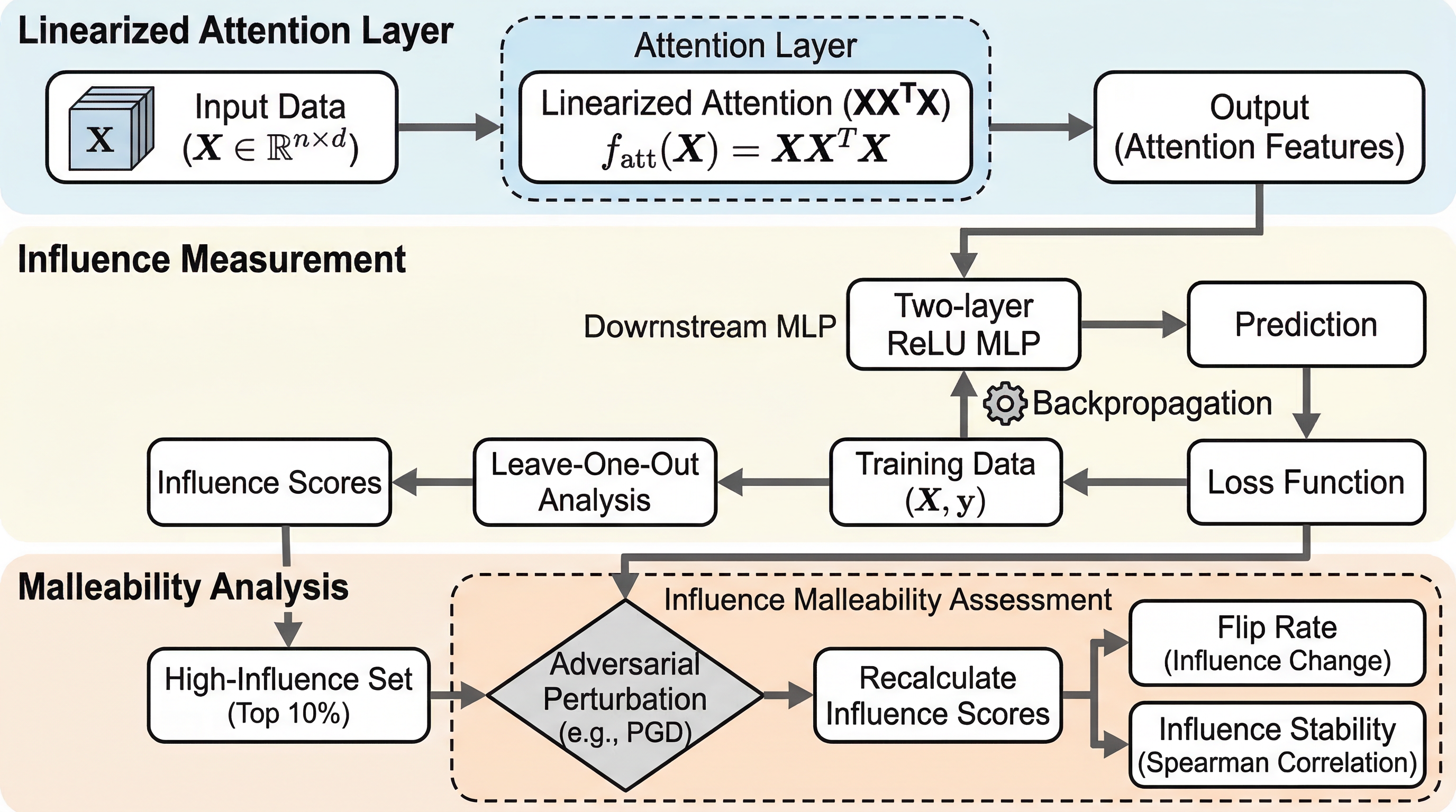 提案の中心は、線形化注意を厳密にカーネルとして書き下し、その非収束性とデータ依存性を influence malleability という量で捉える枠組みです。ここで使う注意機構は、標準的な scaled dot-product attention を単純化した、恒等射影かつ softmax を線形化した形で、入力行列 (X) に対して (f_{\mathrm{att}}(X)=XX^TX) と書かれます。複雑な Transformer 全体ではなく、注意の二次的相互作用だけを抜き出した最小構成で、理論的に追える代表例を作っています。 この構成の重要点は、注意後のカーネルが単なる入力内積の関数ではなく、訓練集合全体の Gram 行列 (G=XX^T) に依存することです。…