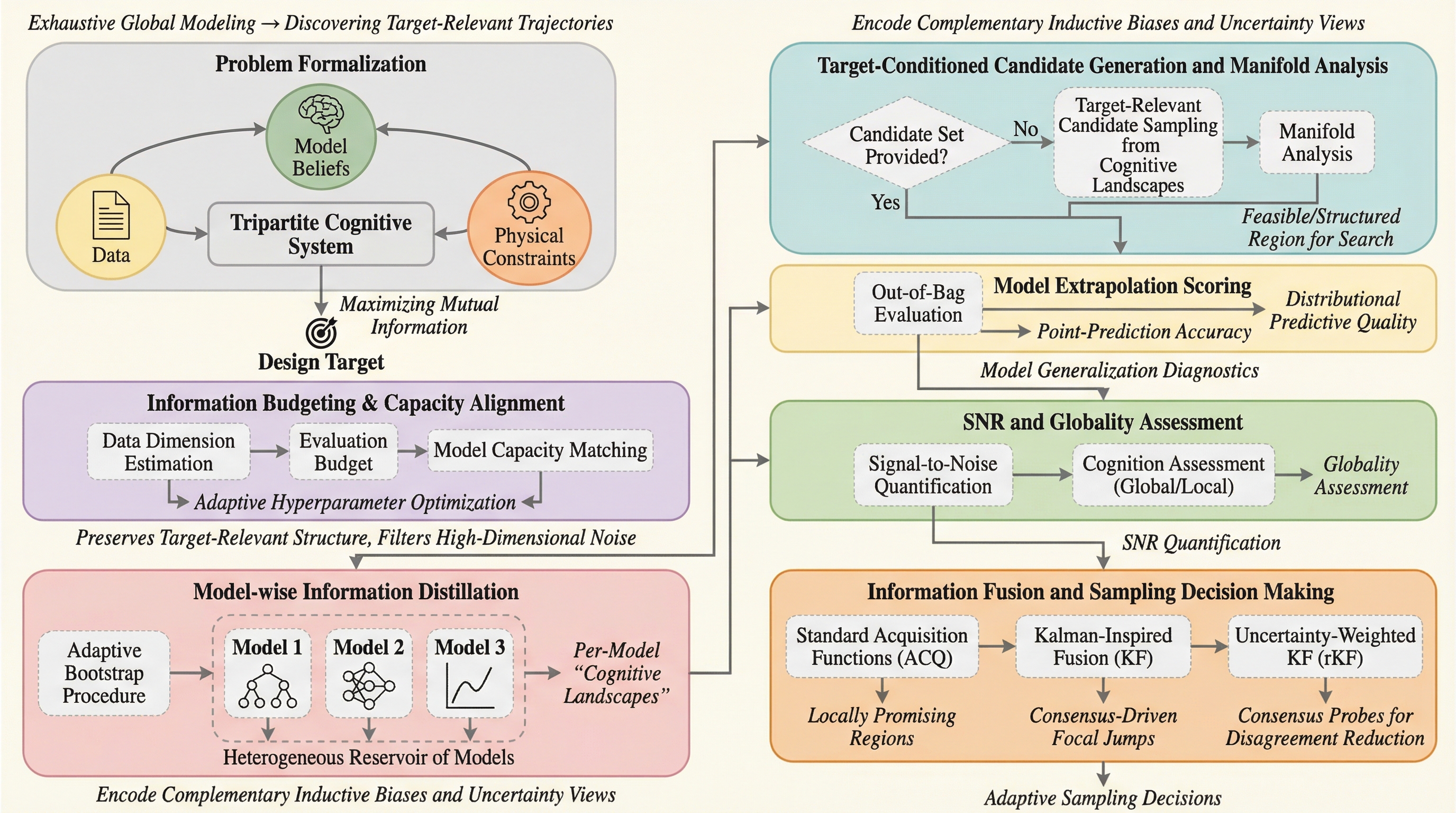 本研究では、最適化を「応答曲面全体の近似」ではなく「目標に向けた軌道の発見」として再定義する、情報理論的なフレームワークを提案しています。この手法は、データ、モデルの確信度、および物理的・構造的な事前知識を統合した「三部構成の認知システム」を構築し、設計目標との相互情報量を最大化するように進化させます。このフレームワークの核心は、探索空間全体を網羅的にモデル化しようとするのではなく、目標に関連する方向に探索を集中させる「低エントロピーの情報状態」を維持・洗練させることにあります。これにより、扱いにくい高次元の探索問題が、目標に関連する低次元の多様体(マニホールド)上の探索へと投影されます。自然界のデータや有効な物理的解は、通常、高次元空間の中に埋め込まれた低次元の多様体上に存在するという理論的洞察に基づき、ターゲットに関連する軌道の複雑さは全探索領域よりもはるかに低いと考えられます。…