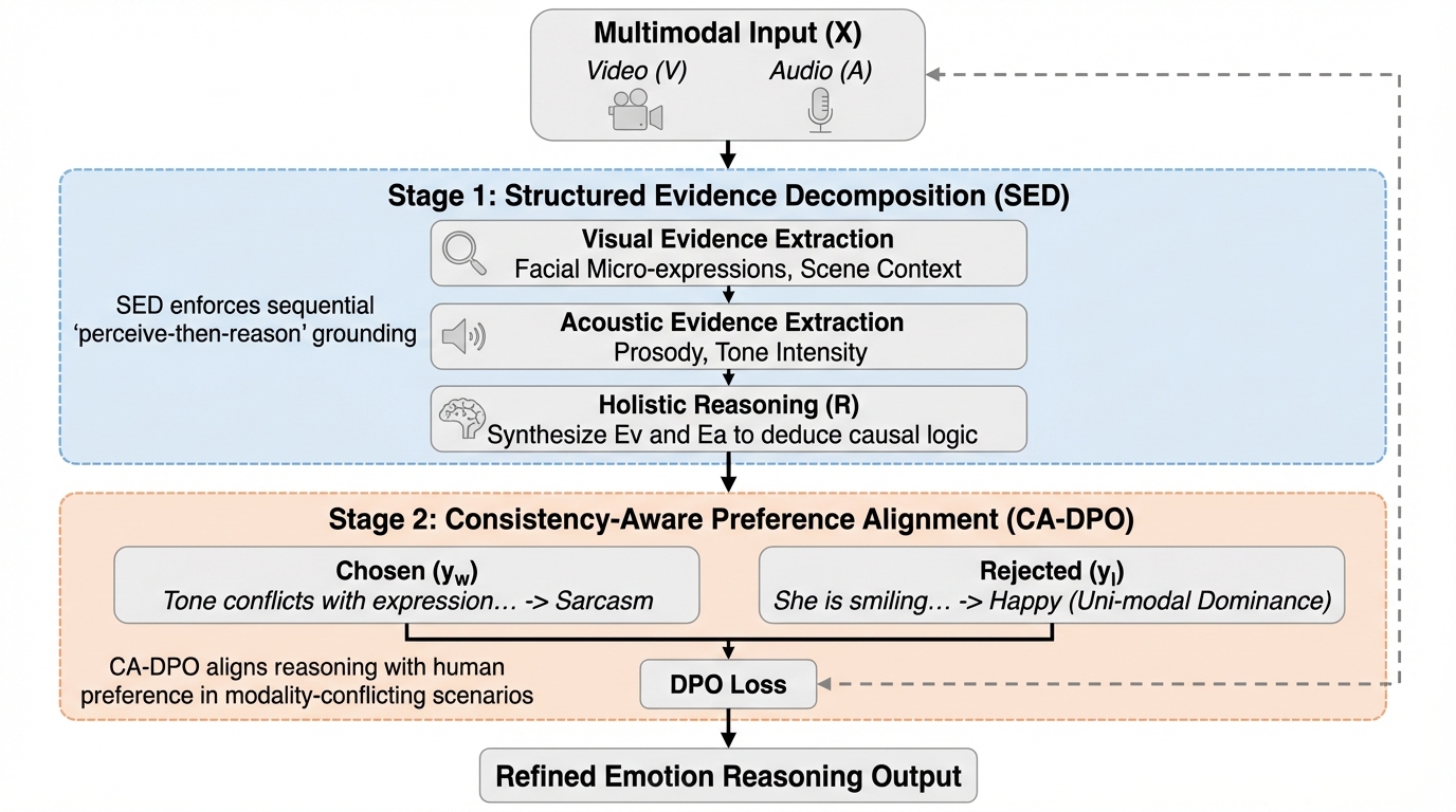 従来のマルチモーダル大規模言語モデルは、視覚と音声の微細な信号を統合できず、特定のモダリティに偏る「単一モダリティ優位」の問題を抱えていました。 本研究では、60万件の動画クリップからなる大規模データセット「SABER」と、証拠抽出を推論から分離する「構造化証拠分解(SED)」パラダイムを提案しました。 この手法により、皮肉などの矛盾する感情表現も正確に解読可能となり、7B規模のモデルでクローズドソースのGemini-2.5-Proに匹敵する性能を達成しました。