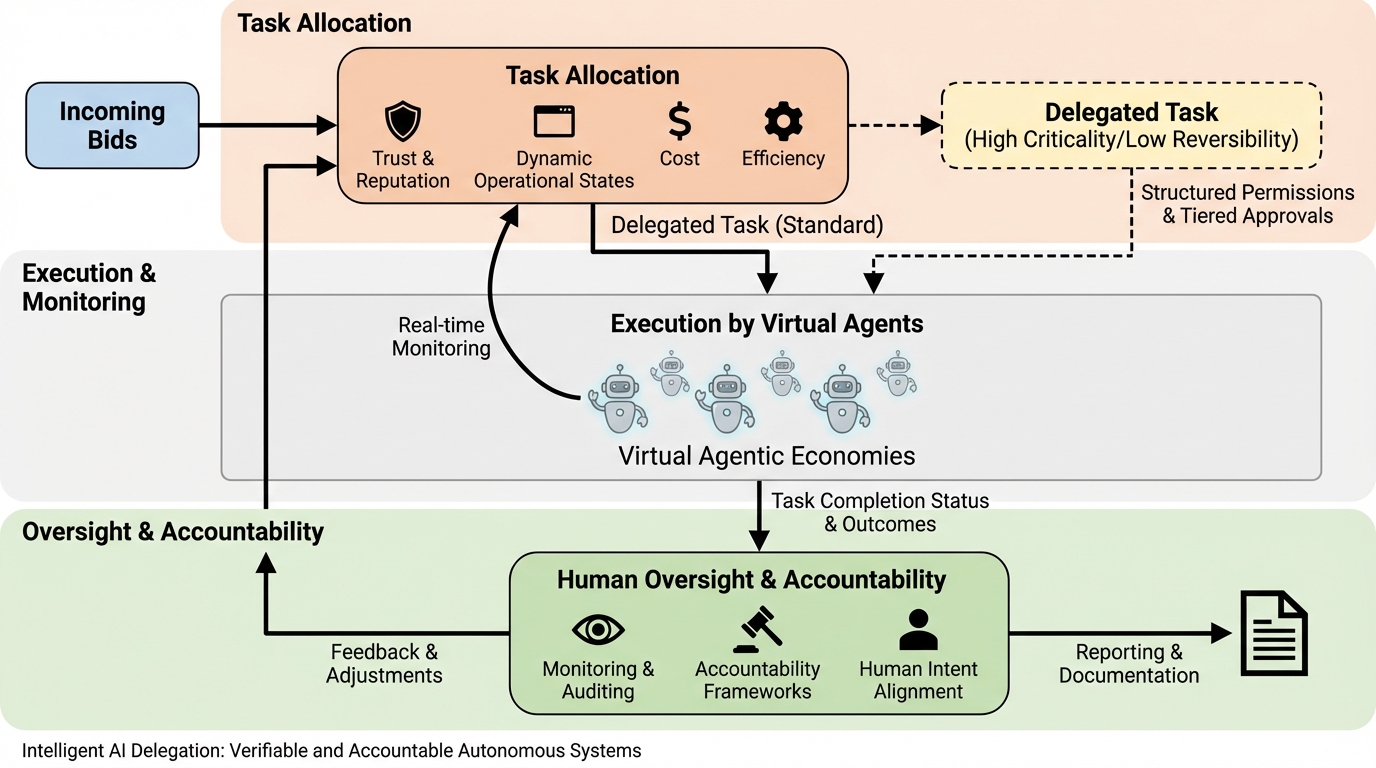 AIエージェントが複雑な目的を扱うほど、委任は単なるタスク分解では足りず、権限の移譲、責任と説明責任、役割と境界、意図の明確化、当事者間の信頼まで含めて設計する必要があります。 / 本論文は、委任を「タスク配分に関する意思決定の連なり」として捉え、環境変化や想定外の失敗に適応しつつ、人間とAIの双方が委任者にも被委任者にもなり得るネットワークで機能する枠組みを整理します。 / あわせて、能力の照合、継続的な性能監視、フィードバックに基づく調整、制約下での完了、信頼の校正といった要素を明示し、将来の「agentic web」に向けたプロトコル設計の論点を提示します。