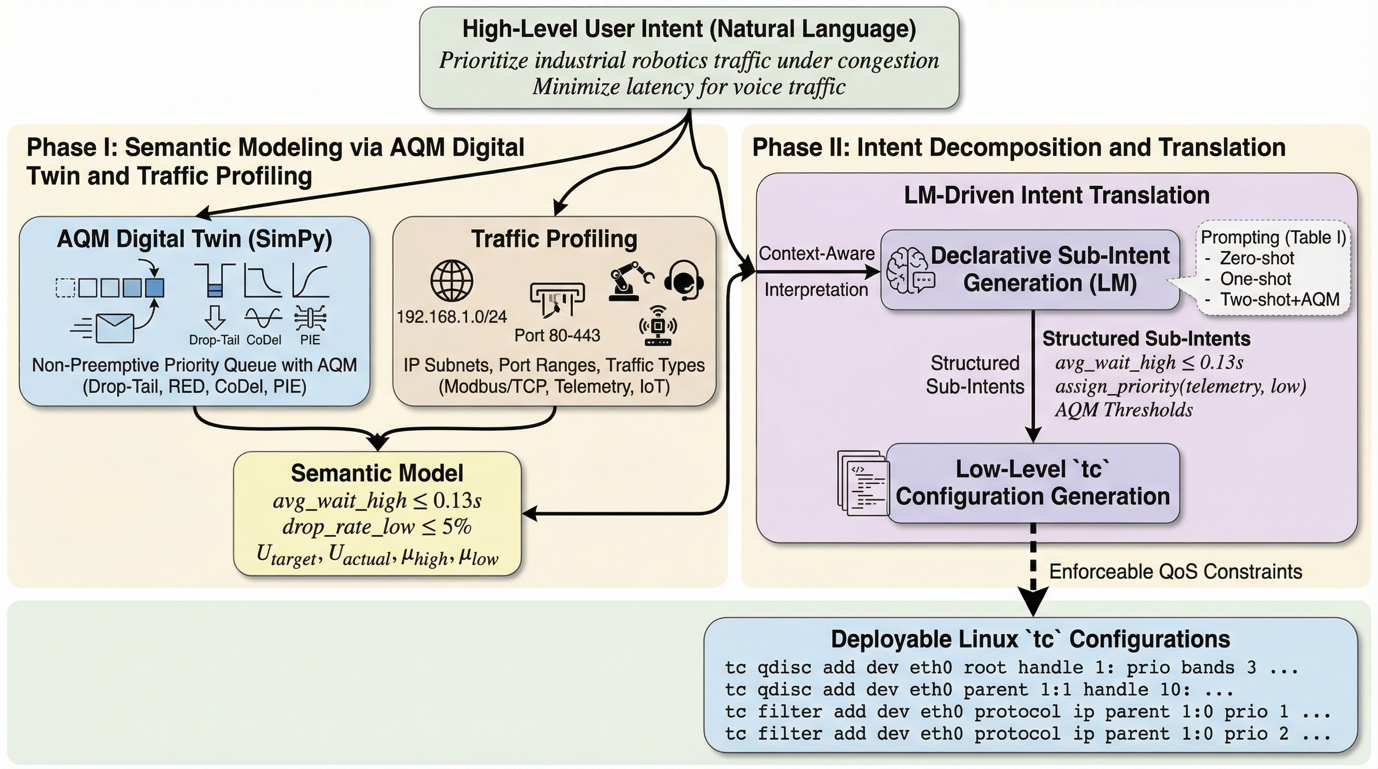 ネットワーク管理者が自然言語で記述した抽象的な「意図」を、Linuxのトラフィック制御(tc)ルールへ自動変換するエンドツーエンドのパイプライン「Intent2QoS」を提案しました。このシステムは、管理者が「ビデオ会議の遅延を最小限にする」といった高レベルな目標を入力するだけで、複雑な低レベルコマンドを自動生成し、専門知識が不足している環境でも高度なQoS設定を可能にします。 キューイング理論に基づくデジタルツインを用いたセマンティックモデルと言語モデルを統合することで、従来の言語モデル単体では困難だったネットワークの物理的挙動の考慮と正確な設定生成を実現しました。これにより、単なる構文の正しさだけでなく、遅延やパケットドロップ率といった物理的な制約を反映した、実際にデプロイ可能な設定セットの出力が可能になります。 100件の意図を用いた検証では、LLaMA3(8B)がセマンティック類似度0.88を達成し、AQM情報を活用したプロンプト手法により設定のばらつきを従来の3分の1に抑制できることが示されました。このフレームワークは、手動設定に伴うヒューマンエラーを排除し、ネットワーク運用のスケーラビリティを大幅に向上させる強力な基盤を提供します。