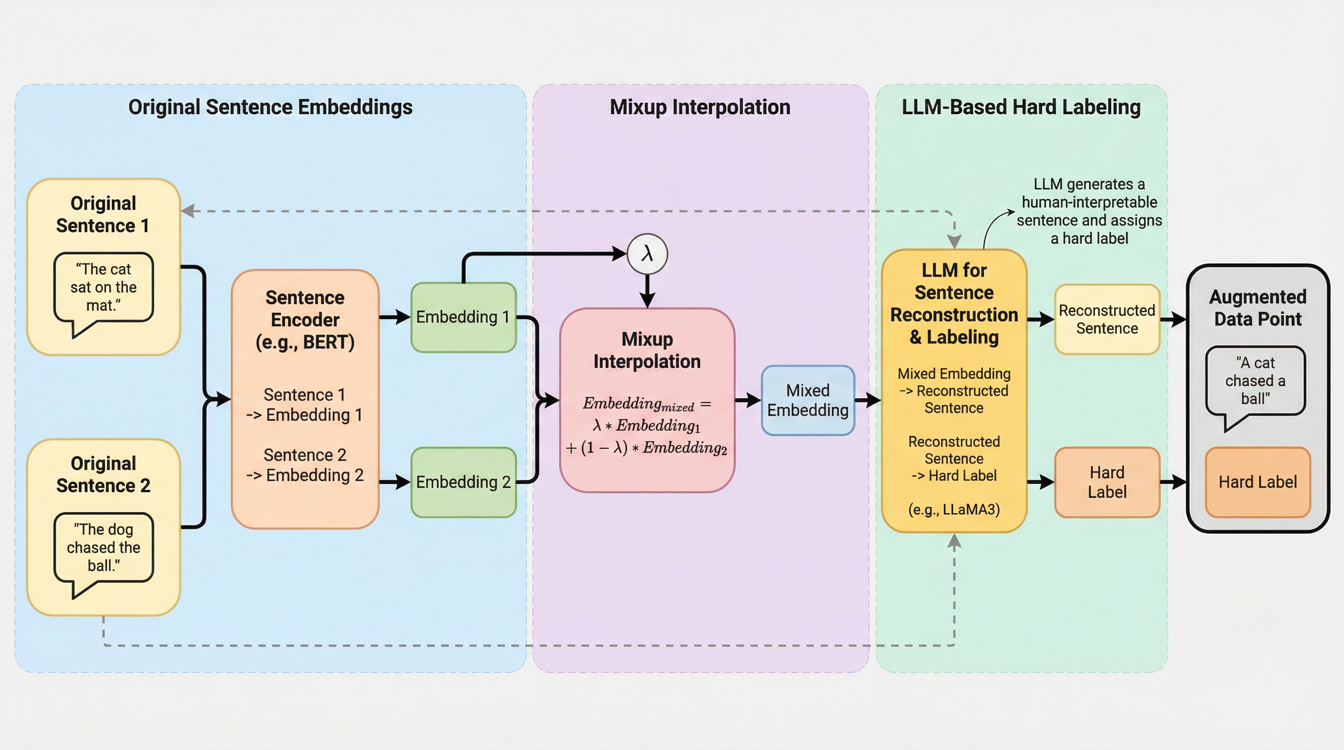 inversedMixupは、埋め込み空間での線形補間を行うMixupの精密な制御性と、大規模言語モデル(LLM)によるトークンレベル生成の解釈性を統合した、新しいデータ拡張フレームワークである。 タスク固有モデルの出力空間とLLMの入力空間をアダプターで接続する3段階の学習手順を導入し、数学的に混合された埋め込みから、人間が理解可能な自然言語の文章を再構築することに成功した。 テキストにおけるマニホールド・イントルージョン現象を初めて実証的に特定し、LLMを用いて生成された文章に新しいラベルを割り当てることでこの問題を軽減し、モデルの性能と汎化性能を大幅に向上させた。
