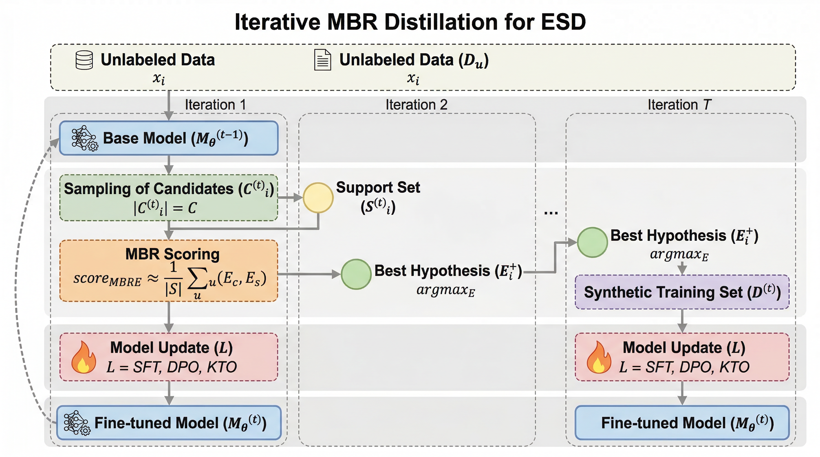 提案の中心は Iterative MBR Distillation for ESD です。考え方は、モデルに未ラベルの source-translation ペアを与え、多数の誤りスパン候補を生成させ、その候補群の中から MBR 復号で最も良いものを疑似教師として選び、再学習に使うというものです。この流れを1回で終わらせず、モデル更新後にもう一度候補生成から繰り返します。