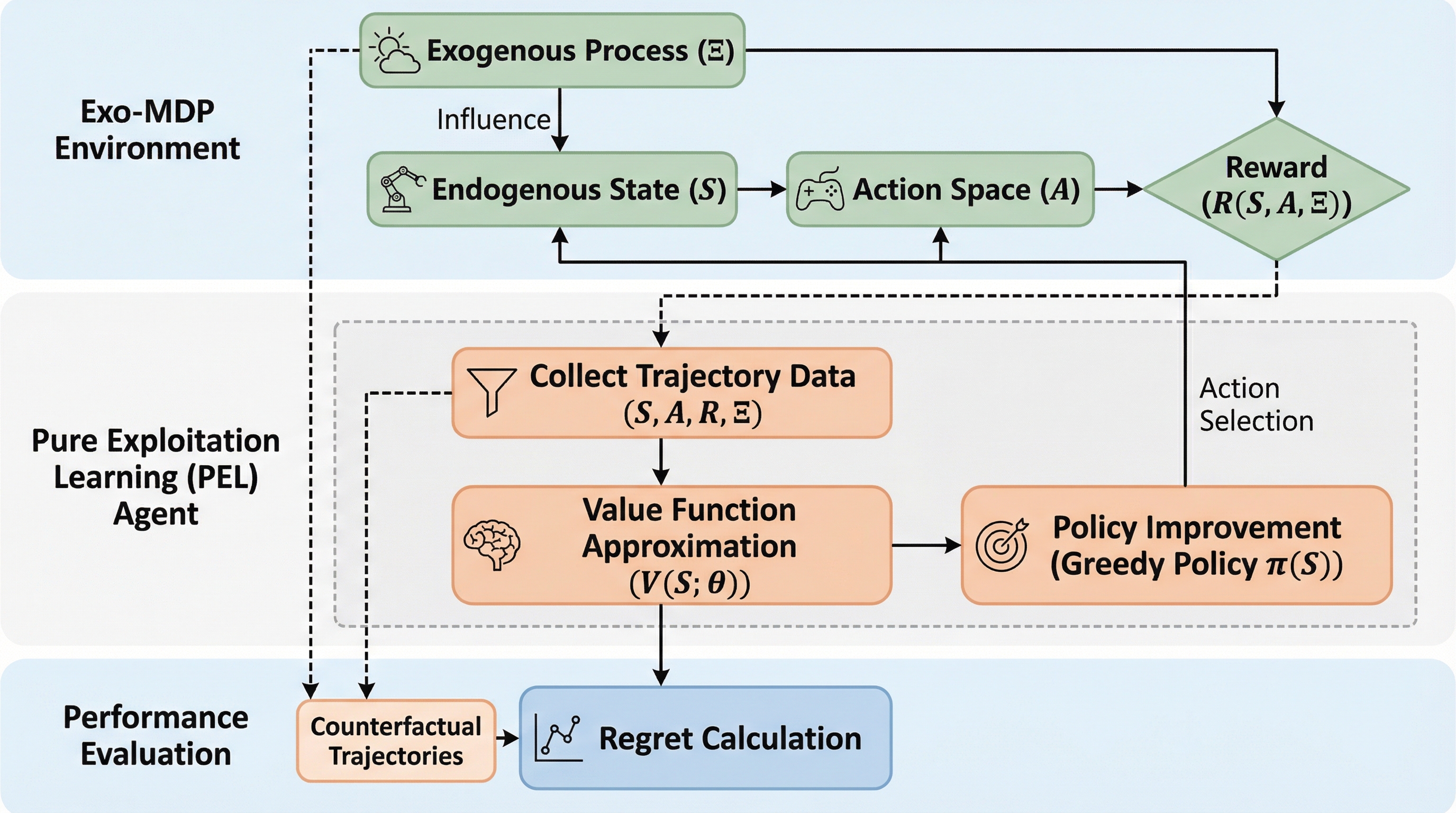 外生的MDP(Exo-MDP)は、需要や価格などの外部要因が意思決定者の行動に依存せず進化するモデルであり、本研究は探索を一切行わない「純粋な活用(Pure Exploitation)」のみで理論的に最適な学習が可能であることを初めて証明しました。