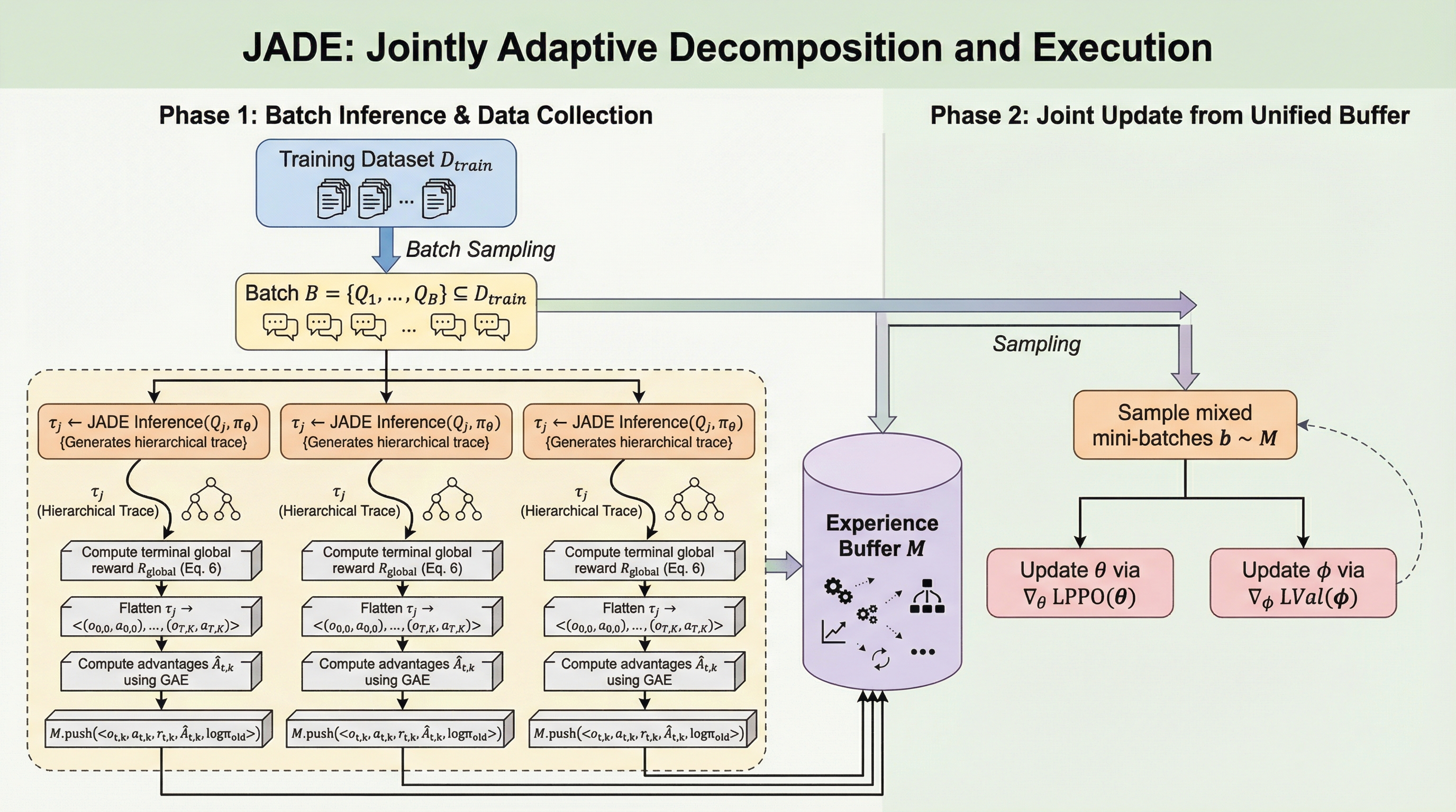 本論文は、動的な多段階ワークフロー内での計画と実行を共同で最適化するための統一フレームワーク「JADE(Joint Agentic Dynamic Execution)」を提案している。JADEの核心的なアイデアは、システムを単一の共有バックボーン(大規模言語モデル)の下で統合された、協調的なマルチエージェントチームとして再定義することにある。これにより、最終的な結果に基づいた報酬(Outcome-based rewards)によって駆動されるエンドツーエンドの学習が可能になり、従来のバラバラだったモジュール群を一つの有機的なシステムへと昇華させている。…