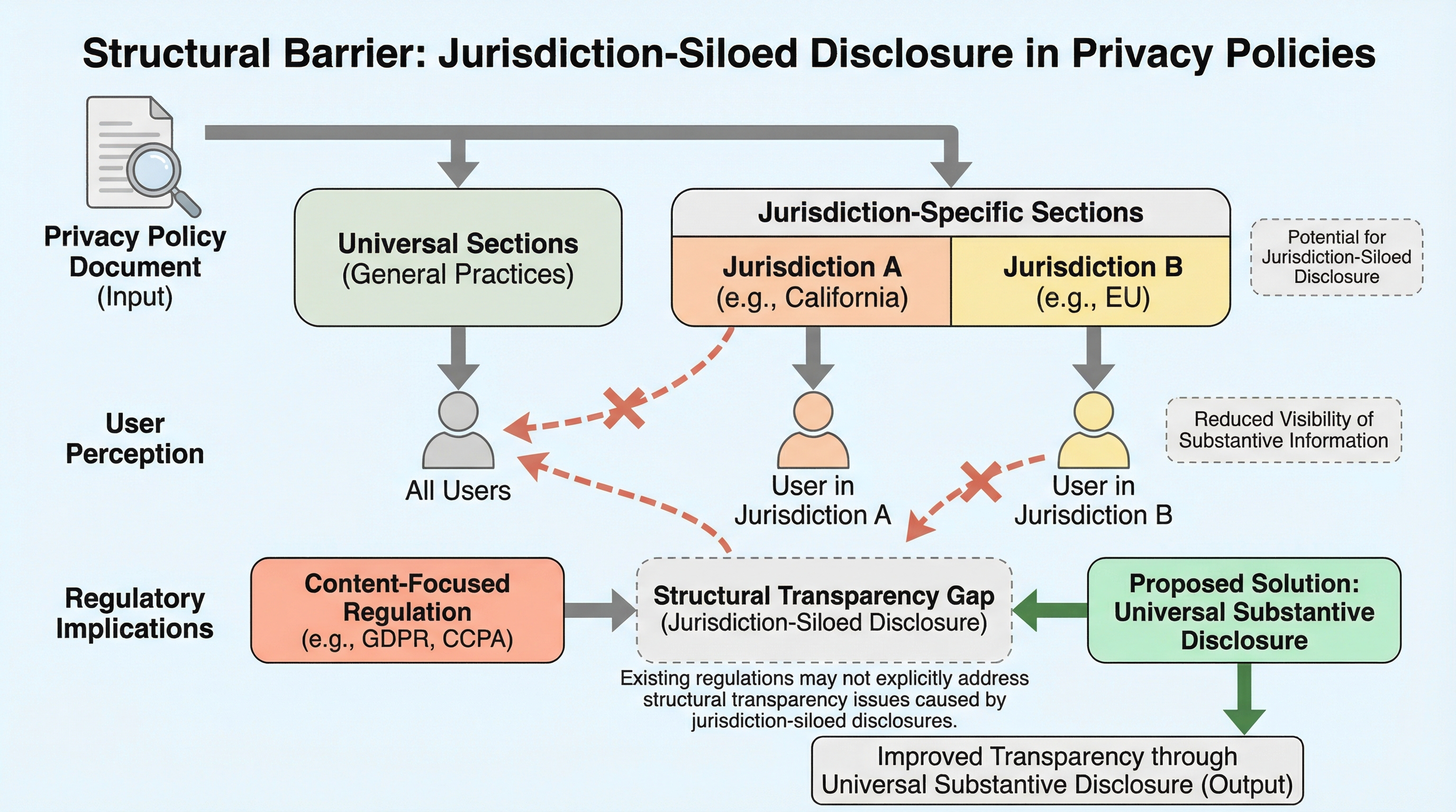 プライバシーポリシーにおいて、データの販売や生体情報の収集といった重要な実質的情報の開示が、特定の地域(カリフォルニア州や欧州など)の居住者向けセクションのみに限定され、一般セクションでは曖昧な表現に留まる「管轄権による情報のサイロ化」という構造的パターンを特定しました。 主要企業123社を調査した結果、調査対象の約6割にあたる77社でこのパターンが確認され、ユーザーが自分に関係ないと判断して地域別セクションを読み飛ばす「情報探索理論」に基づくと、規制の緩い地域のユーザーは自分たちに影響する重要なデータ処理の実態を把握できないという透明性の欠如が生じています。 筆者らは、全ユーザーに影響する実質的なデータ処理内容はポリシーの主文に記載し、地域別セクションには権利行使の手続きのみを記載する「普遍的な実質的開示」という標準的な構成を提案しており、これにより情報の非対称性を解消し、ユーザーの自律的な意思決定を支援するべきであると主張しています。
