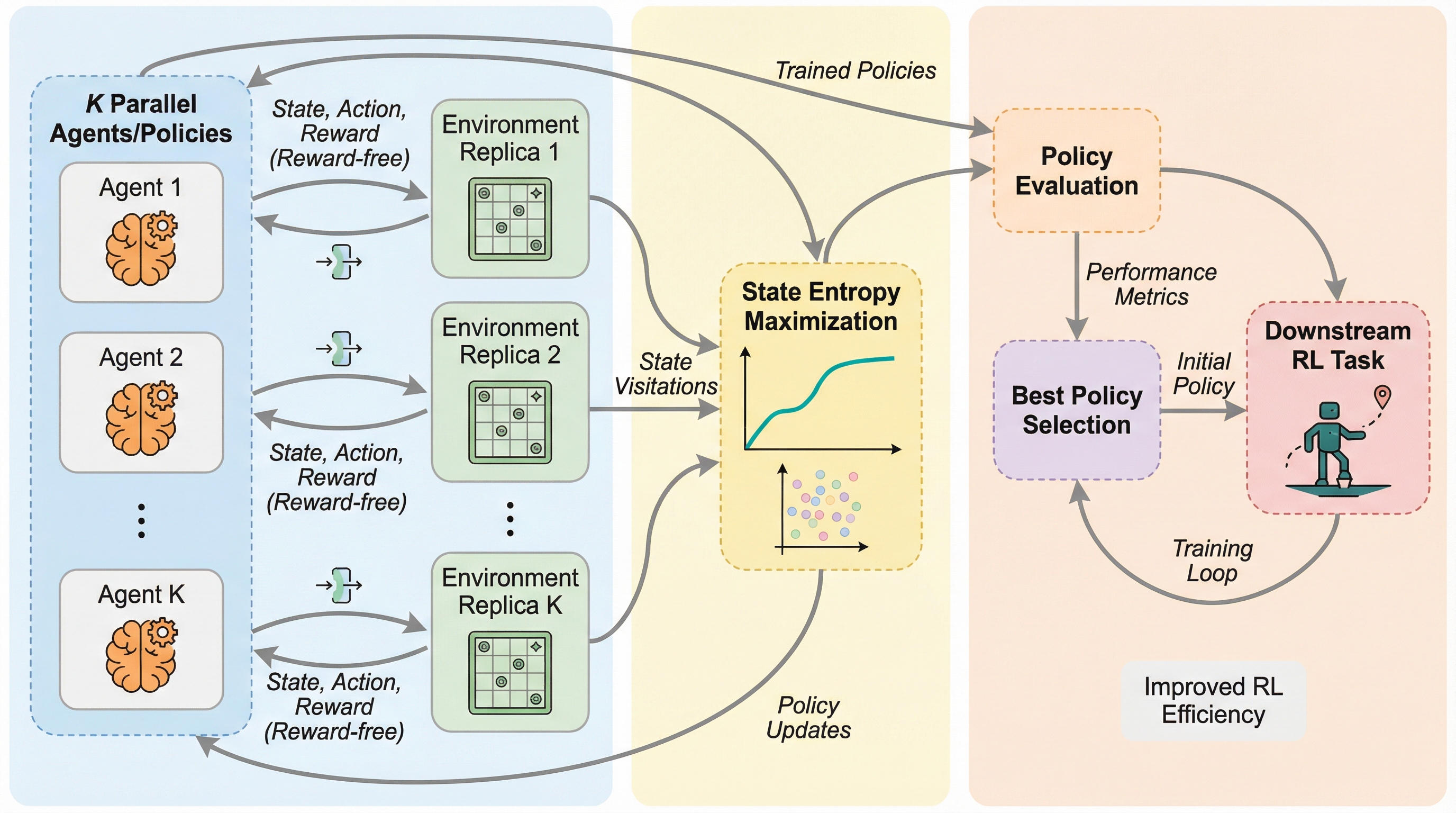 K-Myriadは、大規模な並列環境において複数のエージェントを教師なしで学習させ、集合的な状態エントロピーを最大化することで強化学習の初期探索を効率化する新しい手法である。共有のネットワーク基盤と独立した複数の政策ヘッドを組み合わせたスケーラブルなアーキテクチャにより、高次元の連続制御タスクにおいて多様な専門的探索戦略を同時に構築することが可能である。事前学習された多様な政策集団を初期値として利用することで、未知の報酬タスクにおける学習効率を大幅に向上させ、ランダムな初期化や単一の汎用的政策を超える性能を発揮することを実証した。この手法は、並列計算リソースを単なる高速化の手段としてだけでなく、探索の質を向上させるための戦略的な資産として活用する道を開くものである。