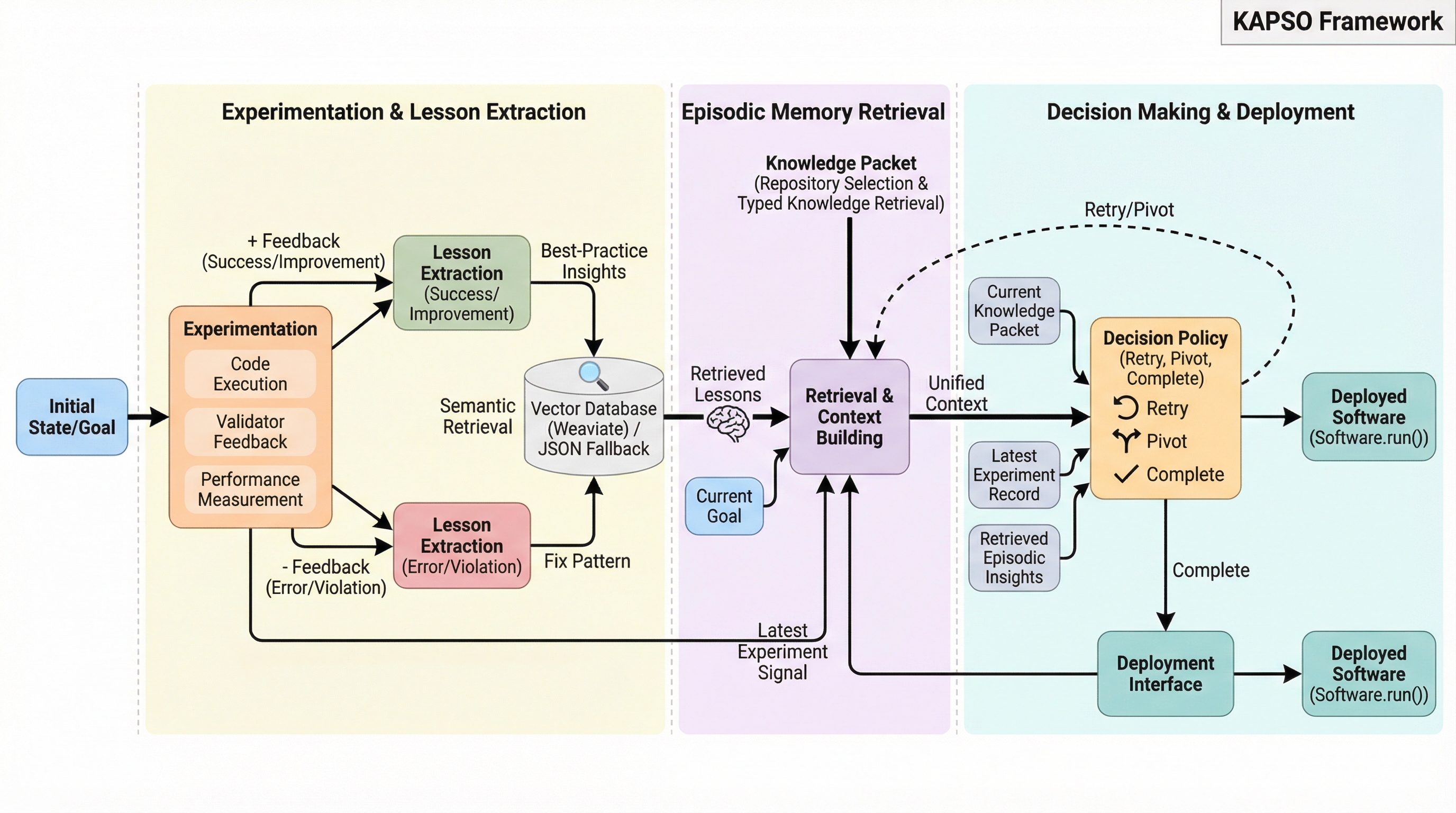 KAPSOは、自然言語の目標と評価方法を入力として、アイデア生成、コード合成、実行、評価、学習を繰り返すことで、測定可能な目標に向けて成果物を自律的に改善し続けるモジュール型フレームワークである。