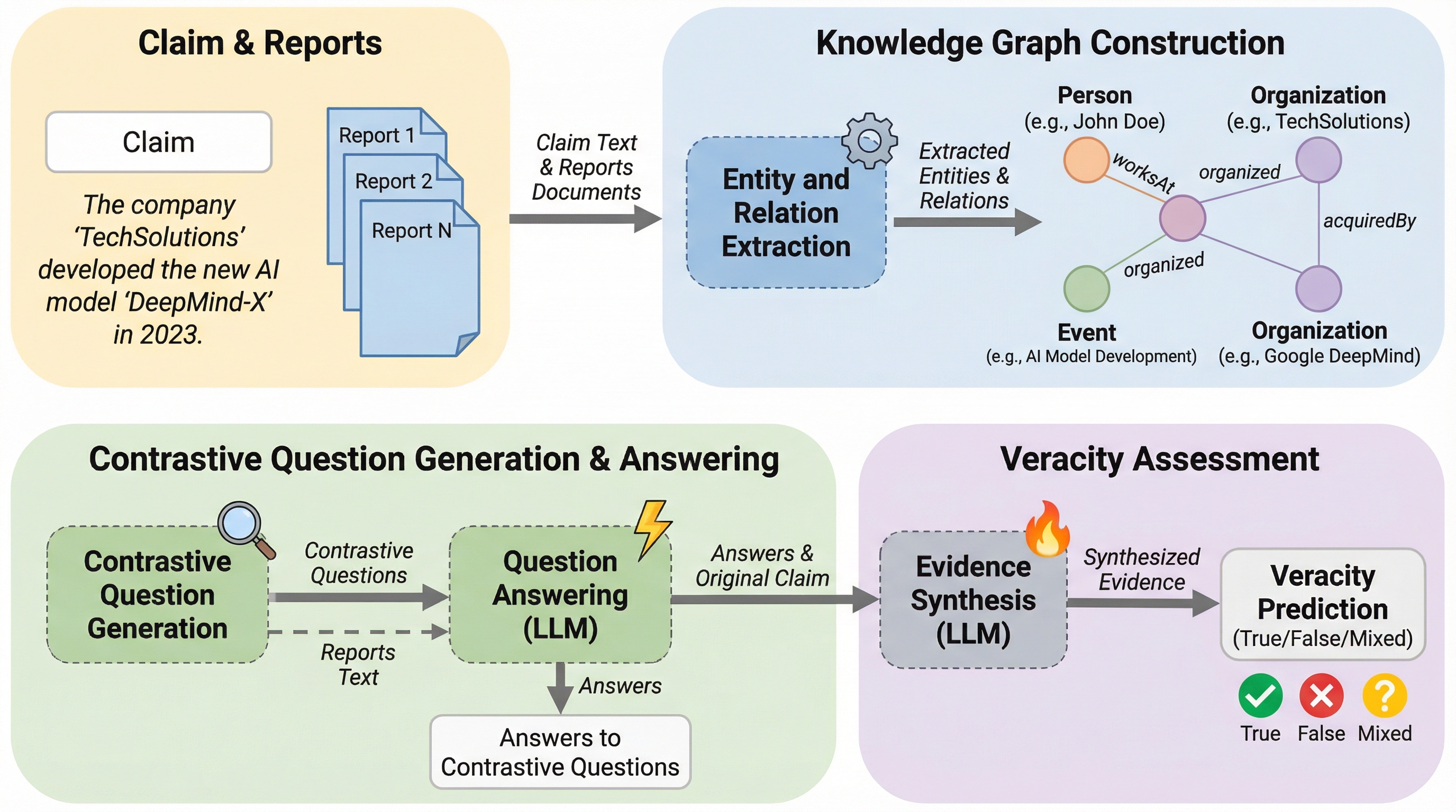 KG-CRAFTは、大規模言語モデル(LLM)と知識グラフ(KG)を融合させ、主張と証拠の間の対照的な関係を深掘りすることで自動ファクトチェックの精度を劇的に向上させる新しいフレームワークです。 主張と関連レポートから知識グラフを構築し、その構造を利用して「なぜ元の要素ではなく別の要素なのか」という対照的な質問を生成・回答することで、ノイズの多い情報から真偽判定に不可欠な核心的証拠を抽出します。 LIAR-RAWおよびRAWFCという2つの現実世界のデータセットを用いた評価において、Llama 3.3 70Bを用いた構成では既存の最高精度モデルに対してF1スコアを最大44ポイント向上させるなど、圧倒的な最先端性能を達成しました。