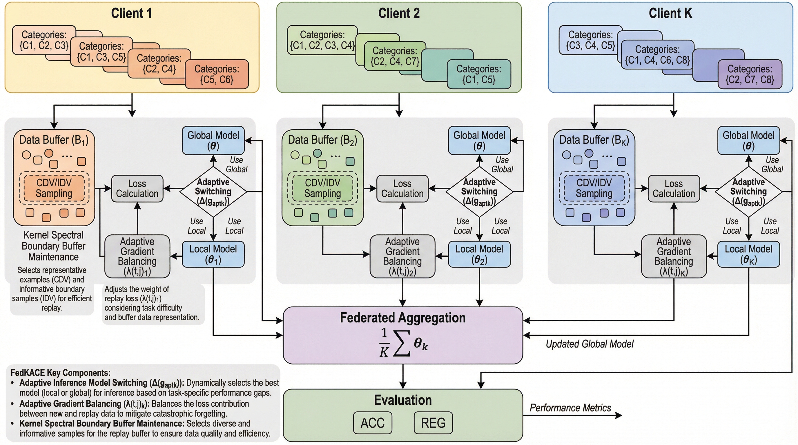 連合学習において、データが連続的に流入し、かつ新旧データ間でカテゴリが重複しながらもタスクの境界を示す識別子(タスクID)が存在しないという、極めて実世界に近い「ストリーミング連合継続学習」の設定を定義し、その特有の課題である知識の混乱や忘却の問題を明確化しました。 この困難な課題を解決するため、推論モデルをローカルからグローバルへ適応的に切り替える仕組み、出力層の勾配比率に基づき新旧知識の学習バランスを自動調整するリプレイ手法、およびカーネルスペクトル境界理論を用いて重要なサンプルを厳選するバッファ維持法の3要素からなる「FedKACE」フレームワークを提案しました。 理論的な後悔(リグレット)分析と広範な実験により、提案手法が理論的な収束性と優れた汎用性能を両立し、通信や計算の負荷を最小限に抑えつつ、データの異質性が高い環境でも過去の知識を保持しながら新しい知識を効率的に獲得できることを実証しました。