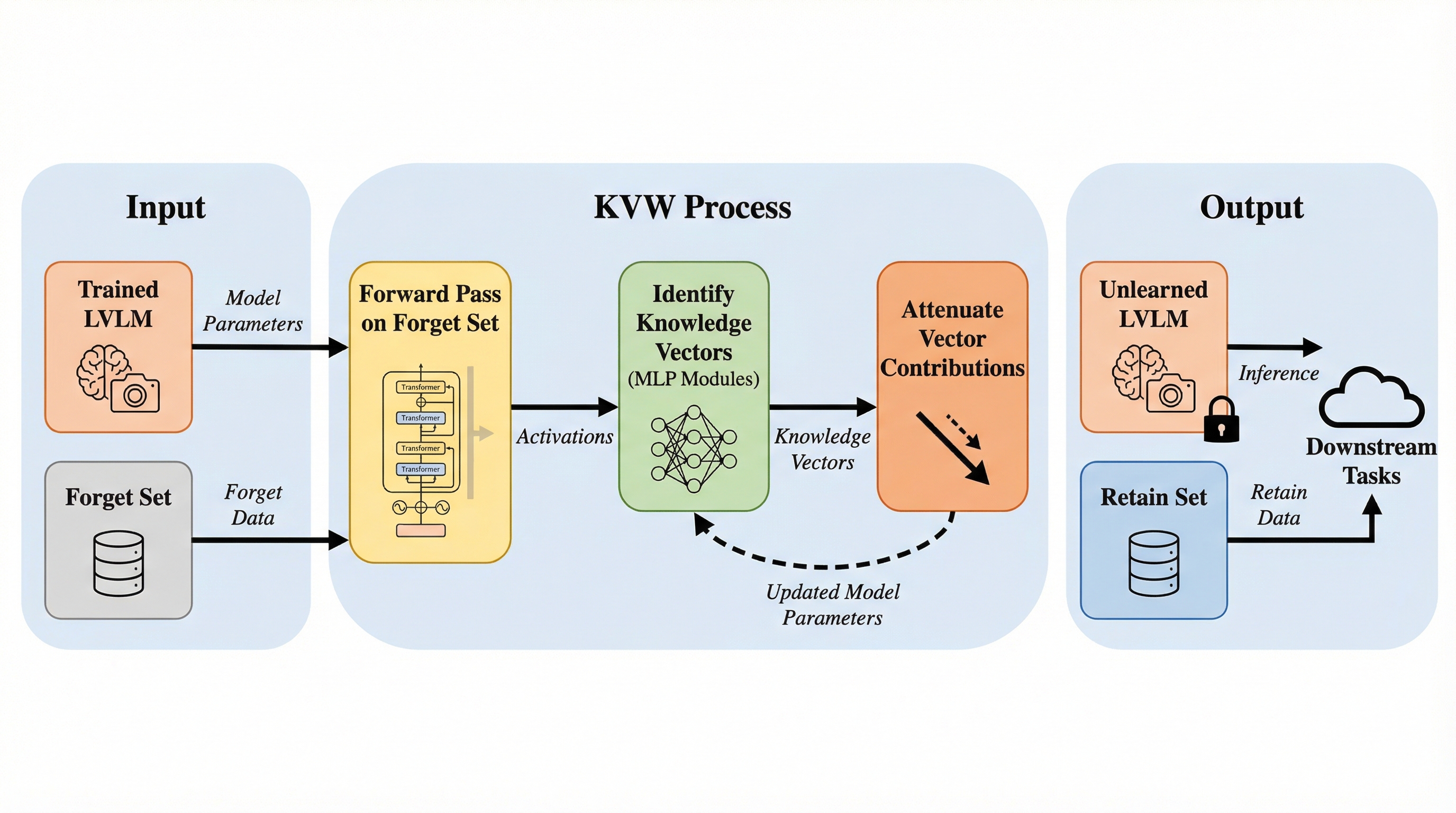 大規模視覚言語モデル(LVLM)において、プライバシー侵害や有害情報の生成を防ぐために特定の学習データの影響を取り除く「アンラーニング」を、勾配計算や再学習を一切行わず、推論時の順伝播のみで実現する新手法「Knowledge Vector Weakening(KVW)」が提案されました。