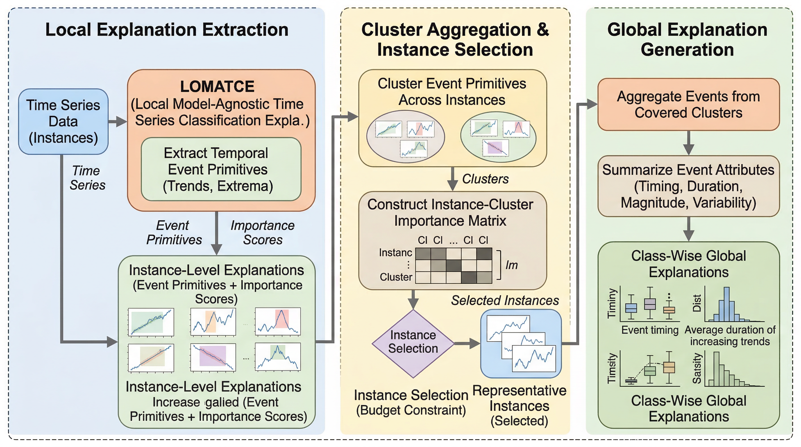 提案の中心は L2GTX、すなわち Local-to-Global Time-series eXplanations です。発想は単純で、まず各サンプルごとに局所説明を取り、その中から重要な時間イベントのクラスタを抽出します。次に、それらをサンプル間でマージして大域クラスタを作り、どのクラスタがどれだけ多くの代表事例で重要だったかを集計します。最後に、予算内で代表サンプルを選び、そこに現れたイベントの属性を平均とばらつきで要約して、クラスごとの説明として出します。