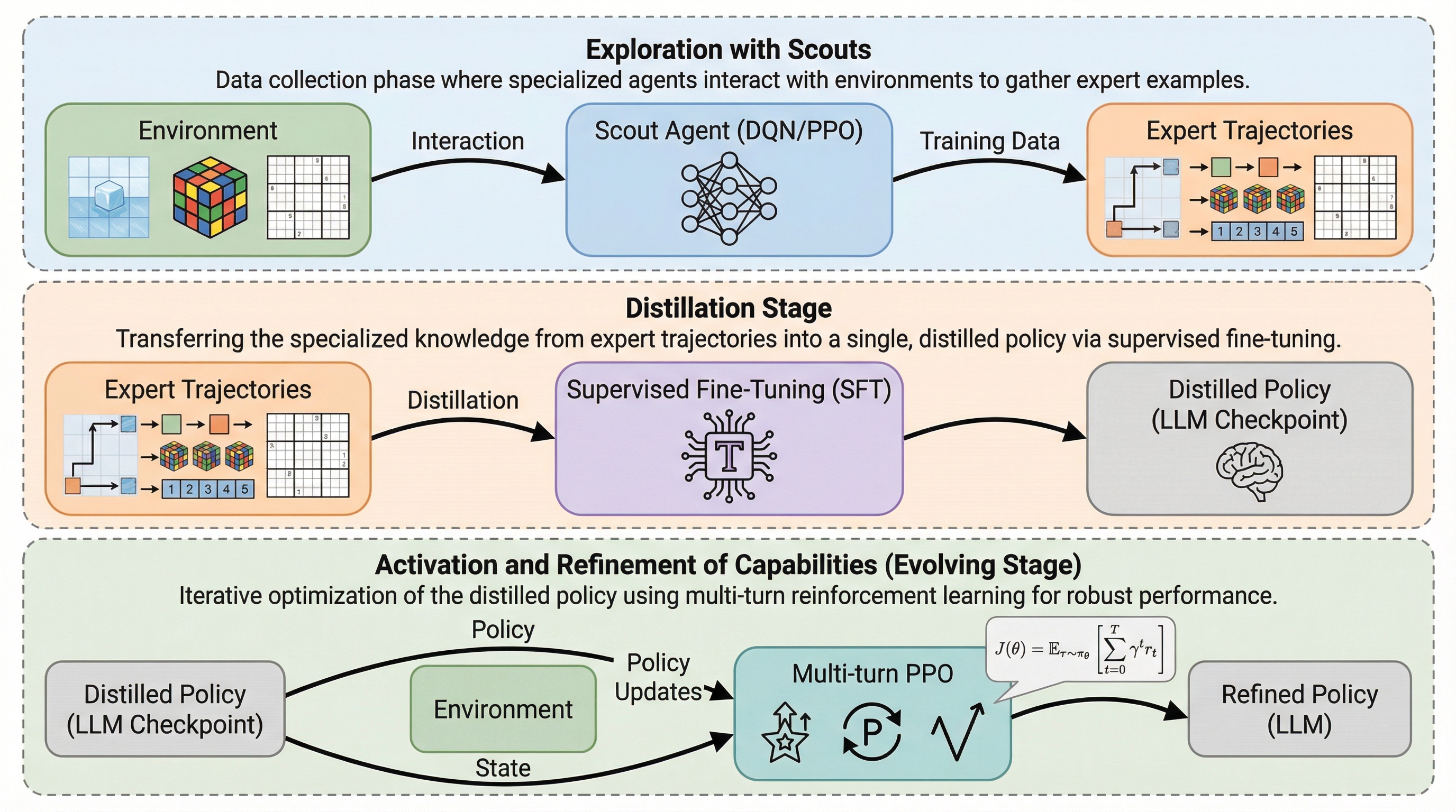 大規模言語モデル(LLM)は言語タスクには強いものの、記号や空間を扱う未知の非言語タスクでは、膨大なパラメータによる試行錯誤の計算コストが極めて高く、効率的な探索が困難であるという根本的な課題を抱えている。 本研究が提案するSCOUTフレームワークは、軽量な「スカウト」モデルに環境動態を高速かつ大規模に探索させ、得られた成功軌跡をテキスト化してLLMに教師あり微調整(SFT)と多段階強化学習(RL)を施すことで、探索と活用のプロセスを完全に分離する。 実証実験では、Qwen2.5-3B-Instructを用いたSCOUTが平均スコア0.86を記録し、Gemini-2.5-Proなどの強力な商用モデルを大幅に上回る性能を示しただけでなく、GPUの消費時間を約60%削減することに成功し、未知の領域における高い適応能力と効率性を証明した。