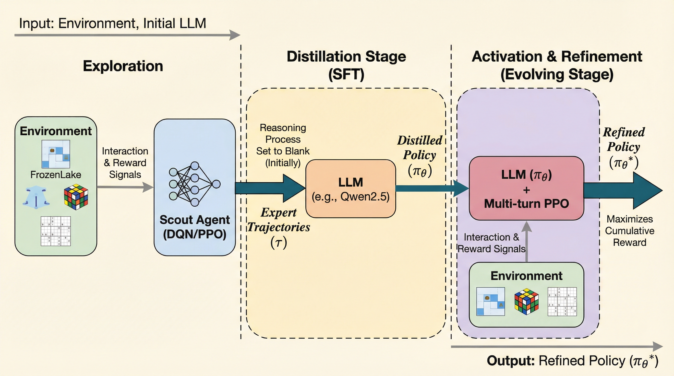 大規模言語モデル(LLM)は言語タスクには強いものの、記号的・空間的な未知のタスクでは膨大なパラメータによる探索コストが障壁となり、試行錯誤の効率が著しく低いという課題がある。 本研究が提案するSCOUTは、軽量なニューラルネットワーク(スカウト)に環境探索を任せて成功軌跡を生成し、それをテキスト化してLLMに蒸留した後、多ターン強化学習で能力を活性化させる新しいフレームワークである。 実証実験では、Qwen2.5-3Bモデルが平均スコア0.86を記録し、Gemini-2.5-Proなどの商用モデルを大幅に上回る性能を示しながら、計算リソースであるGPU時間を約60%削減することに成功した。