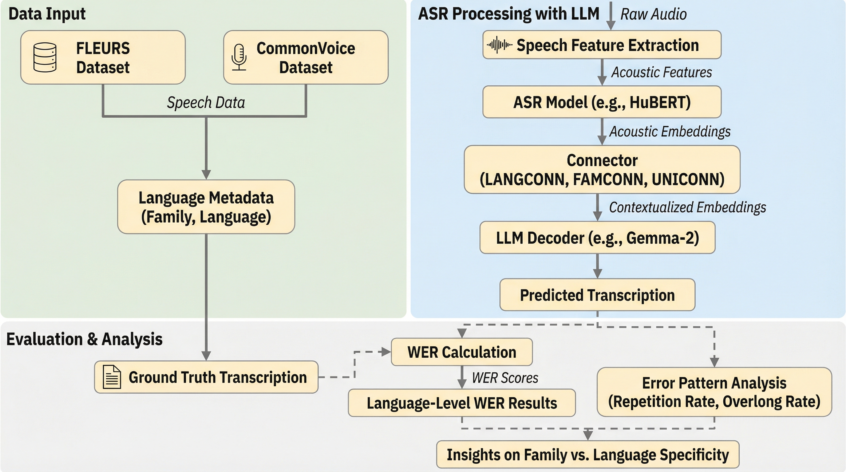 本研究では、言語的な語族のメンバーシップに基づいた、効率的で斬新な「コネクタ共有戦略」を提案している。従来のSpeechLLMベースのASRシステムでは、言語ごとに個別のコネクタ(LANGCONN)を学習させることが一般的であったが、この手法では言語間の関連性が無視されてしまうという問題があった。これに対し、提案手法では同じ語族に属する言語間で一つのコネクタ(FAMCONN)を共有する。これにより、パラメータ数を抑えつつ、言語間の音韻的および形態的な類似性を効果的に活用することを目指している。この提案の有効性を検証するために、10の語族にわたる約40の言語を対象とした大規模な調査が実施された。…