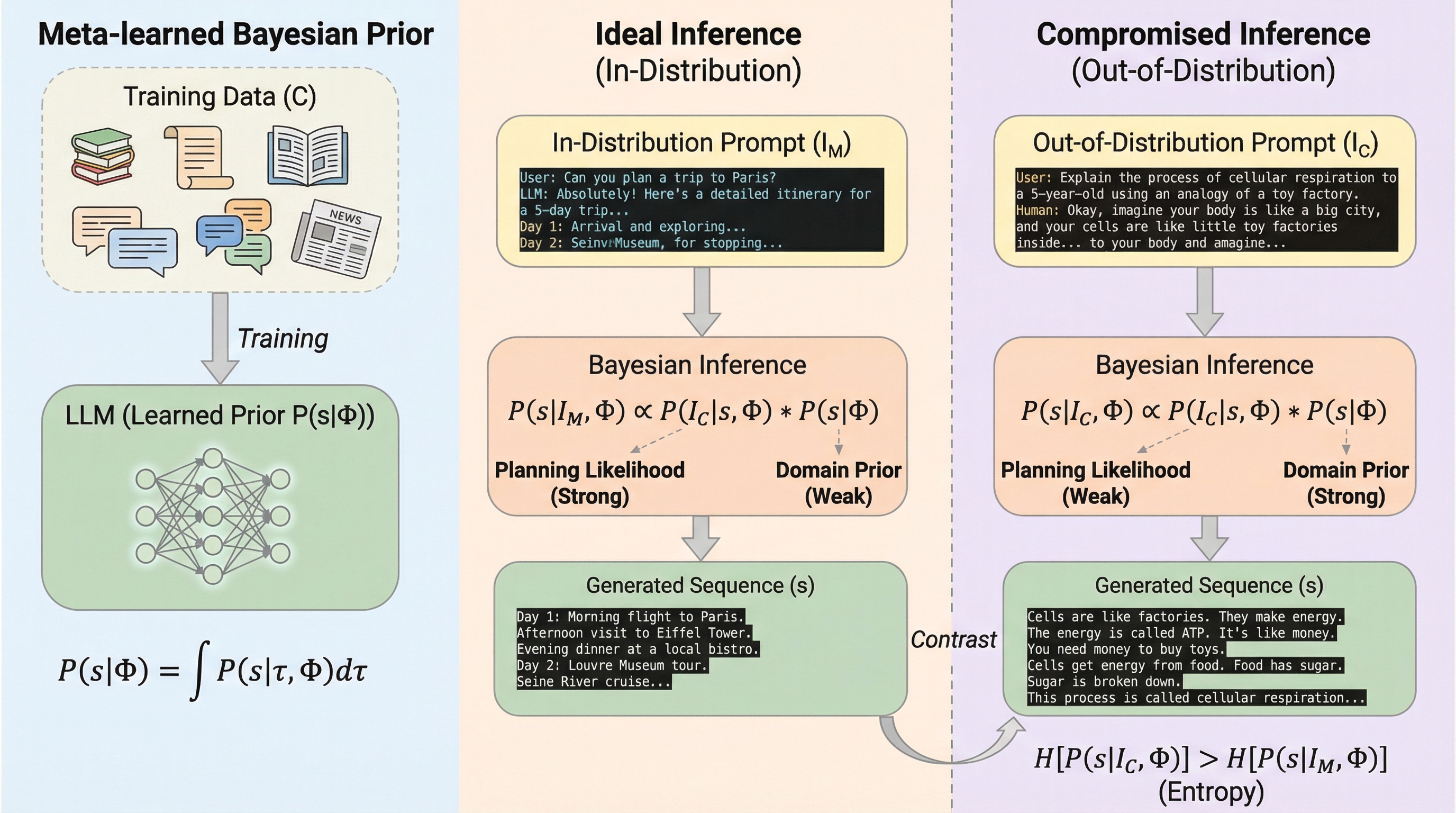 大規模言語モデル(LLM)は学習を通じて高度なシーケンスレベルの計画能力を獲得しているが、推論時には人間が作成したプロンプトとモデル内部の言語表現の乖離により、一時的に短期的で不整合な計画行動を示す。本研究はベイズ推論の枠組みを用い、自己生成された文脈が蓄積されることで不確実性が減少し、初期の「事前分布に偏った計画」から「指示に忠実な計画」へと動的に移行する「計画のシフト」現象を理論的に説明した。ランダムな数値生成およびガウス分布サンプリングの実験により、推論が進むにつれて計画の強度が向上し、初期のバイアスが自己修正される「バイアス発生とその後の解消」という動的な署名が確認され、モデルの潜在的な計画能力が推論プロセスを通じて回復することが証明された。