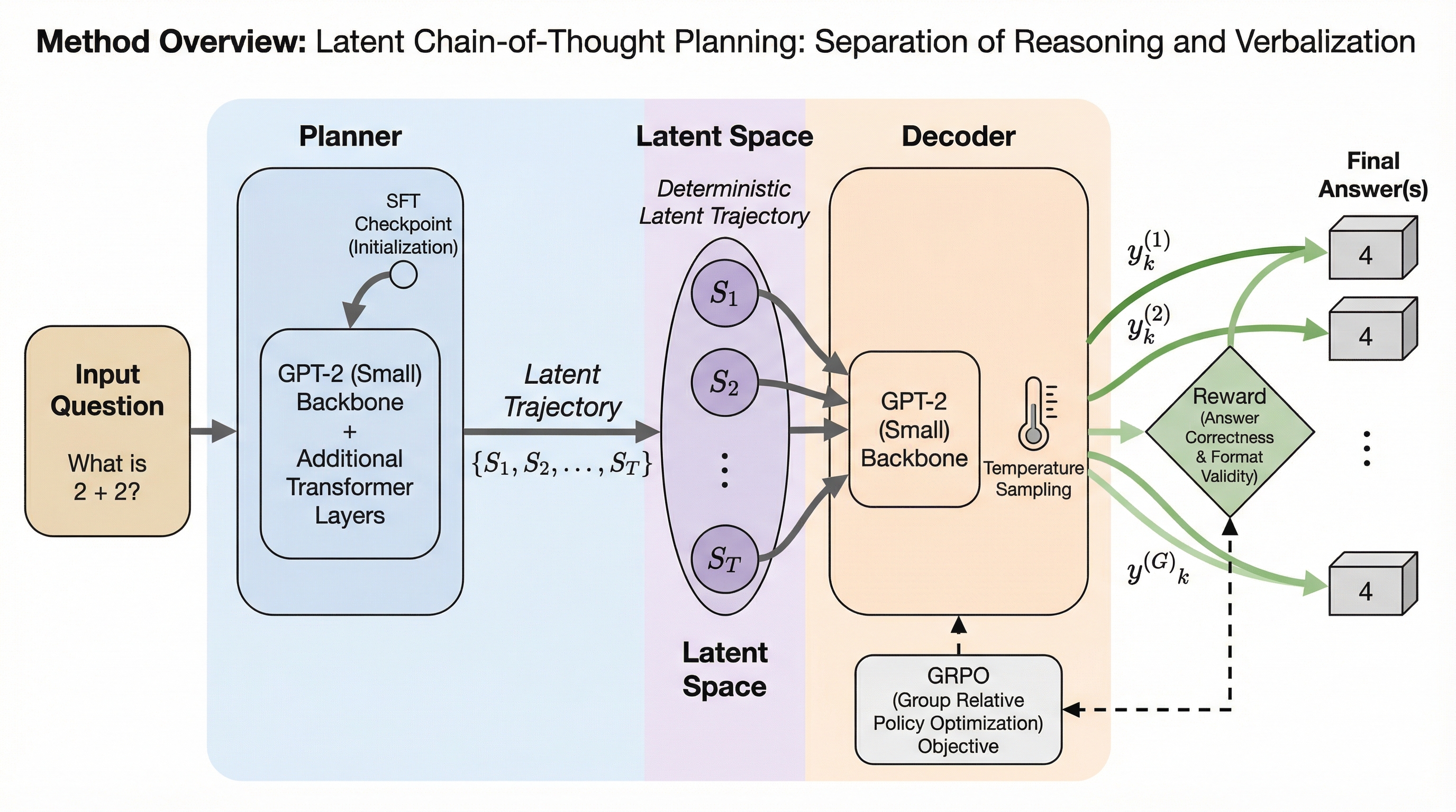 本論文が提案する「PLaT(Planning with Latent Thoughts)」は、潜在的な推論を計画プロセスとして再定式化し、推論と言語化を完全に分離する新しいフレームワークである。このフレームワークの核心は、推論を連続的な多様体上での決定論的な軌跡としてモデル化し、必要に応じて別のデコーダーがそれらの思考をテキストに変換するという設計にある。これにより、モデルは固定されたハイパーパラメータに頼ることなく、推論をいつ終了させるかを動的に決定できるようになる。PLaTのアーキテクチャは、潜在的なプランナーと、言語化のためのデコーダーという二つの独立したコンポーネントで構成されている。…
