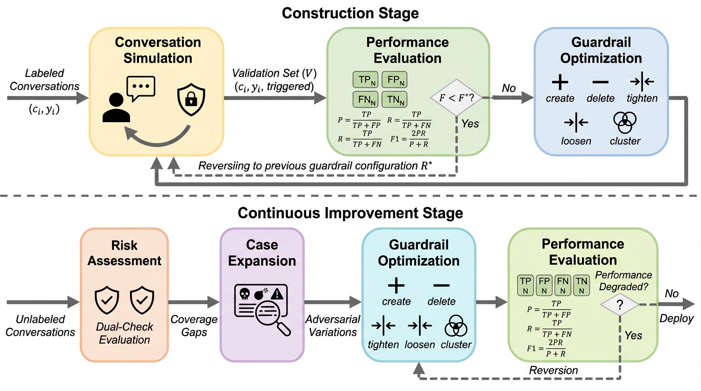 本研究では、ガードレールの構築と適応を継続的な最適化問題として扱うフレームワークである「Lattice」を提案した。Latticeは、設計時に定義された固定ルールに依存するのではなく、反復的な対話シミュレーションを通じて初期のガードレールセットを構築し、さらに展開後も継続的にそれらを改善していくというアプローチをとる。このフレームワークは大きく分けて二つのステージで構成されている。…