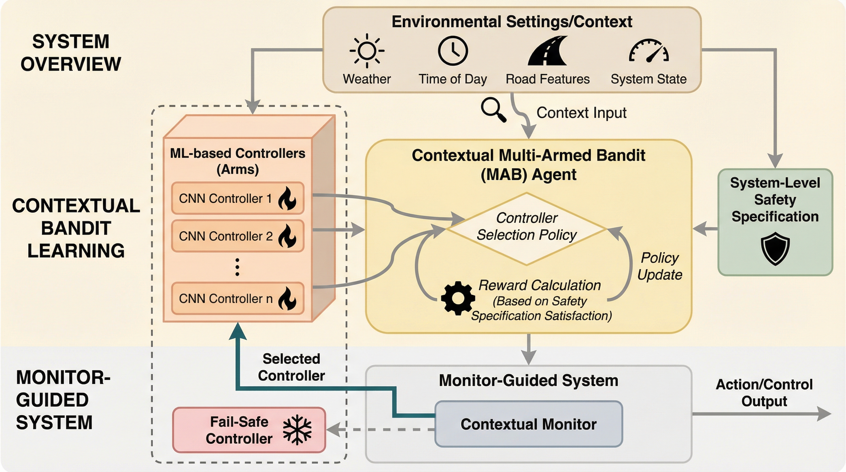 機械学習ベースの制御器は未知の環境において性能が急激に低下し、自律システムの安全性を脅かすという深刻な課題を抱えているが、本研究では複数の制御器の中から現在の環境状況(コンテキスト)に応じて最適なものを選択する「コンテキスト対応ランタイムモニター」を提案し、この問題を解決する。 従来のアンサンブル手法のように複数の出力を平均化して個々の専門性を薄めるのではなく、コンテキスト付き多腕バンディット問題として定式化することで、各制御器の得意分野を最大限に活用し、信頼できる制御器がない場合には安全性が検証済みのフェイルセーフへと動的に切り替える仕組みを構築した。 自動運転のシミュレーションを用いた検証の結果、提案手法は非コンテキスト的な従来手法と比較して安全性と性能の両面で大幅な向上を達成しており、さらに理論的なリグレット最小化に基づく統計的な安全性の保証を提供することで、AIを搭載したサイバーフィジカルシステムの信頼性を飛躍的に高めることに成功した。