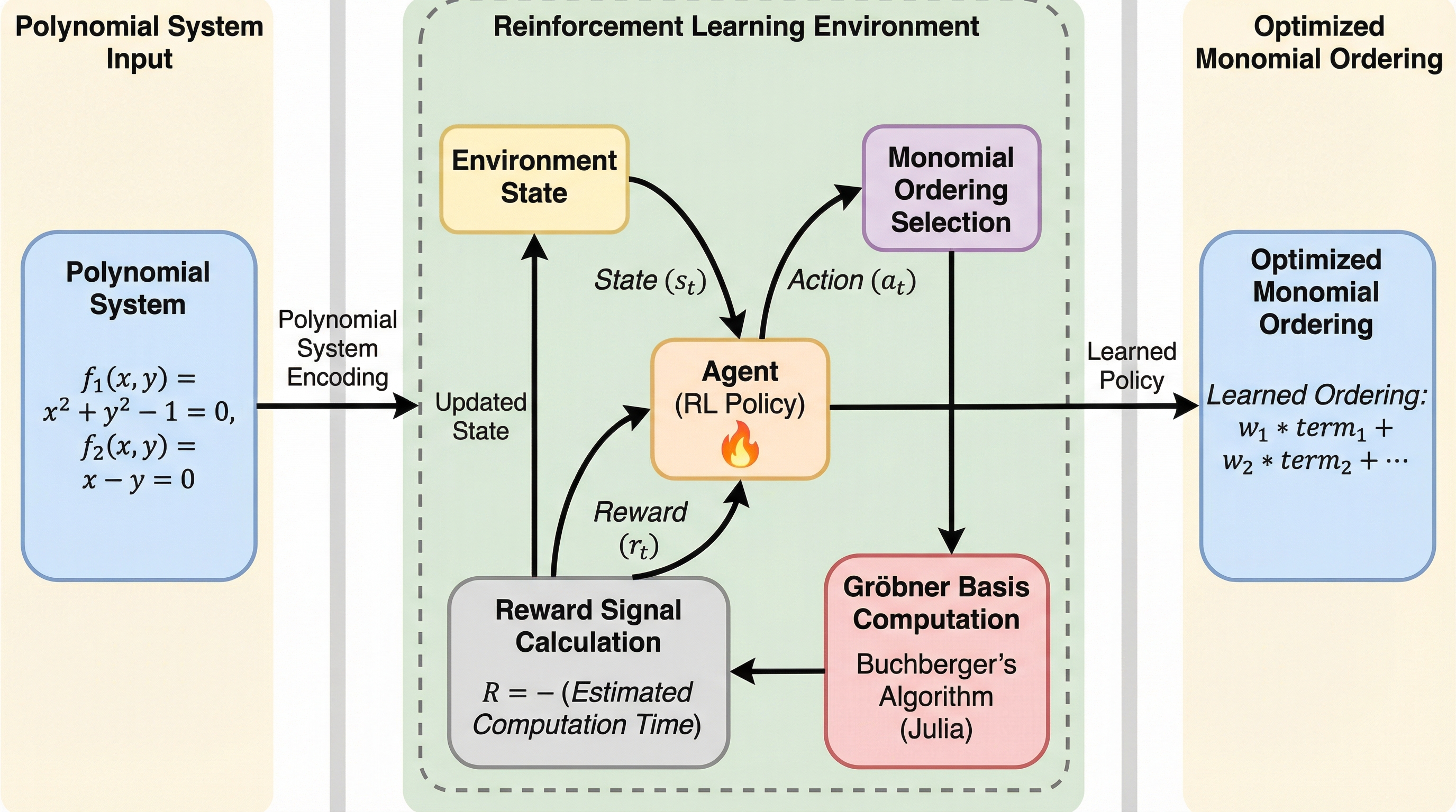 多項式方程式系を解くための基盤技術であるグレブナー基底の計算効率は、単項式順序の選択に決定的に依存するが、従来は専門家の直感に基づくGrevLexなどの静的な手法に頼っており、広大な探索空間であるグレブナー扇の構造は十分に活用されていなかった。 本研究では、単項式順序の選択を強化学習問題として定式化し、F4アルゴリズムの実行統計量に基づく報酬信号を用いて、特定の多項式構造に対して最適な重みベクトルを探索するエージェントを開発し、Julia言語を用いた独自の学習環境を構築することで効率的な最適化を実現した。 システムバイオロジーやコンピュータビジョンの実用的なベンチマークを用いた検証の結果、学習されたポリシーは標準的な手法を安定して上回り、計算コストを最大で70パーセント以上削減することに成功し、深層学習が従来のルールでは捉えきれない複雑な幾何学的構造を利用していることが示された。