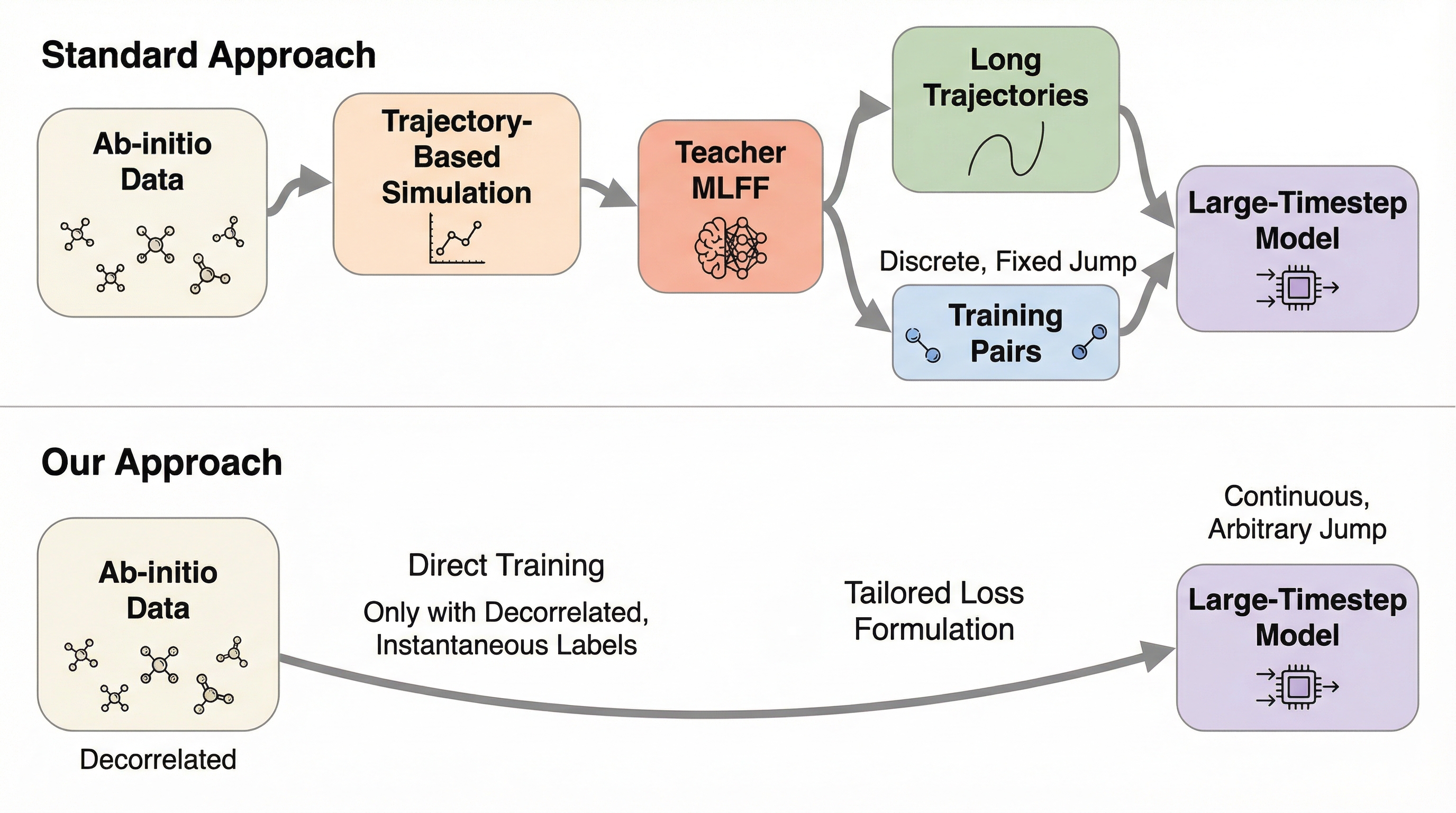 物理システムの挙動を記述するハミルトンの運動方程式を解くことは、科学計算における根幹的な課題です。特に、原子レベルの動きを追跡する分子動力学(MD)シミュレーションは、材料科学や創薬などの分野で不可欠なツールとなっています。しかし、これらの方程式を数値的に解く際、シミュレーションの安定性と精度を維持するためには、タイムステップ(時間刻み)を極めて小さく設定しなければならないという物理的な制約が存在します。この制約により、ナノ秒やマイクロ秒といった現実的な時間スケールの現象をシミュレーションするためには、天文学的な回数の計算ステップを繰り返す必要があり、膨大な計算資源と時間が必要となっていました。 計算コストを削減するために、量子力学的な精度を維持しつつ高速に計算できる機械学習力場(MLFF)が開発されてきましたが、これらはあくまで「ある瞬間の力」を計算するものであり、積分のステップ幅自体を大きくするものではありませんでした。タイムステップを大きくしようとする既存の試みでは、未来の状態を直接予測するモデルが提案されてきましたが、それらの学習には「参照となる正確な軌跡データ」が大量に必要となります。…