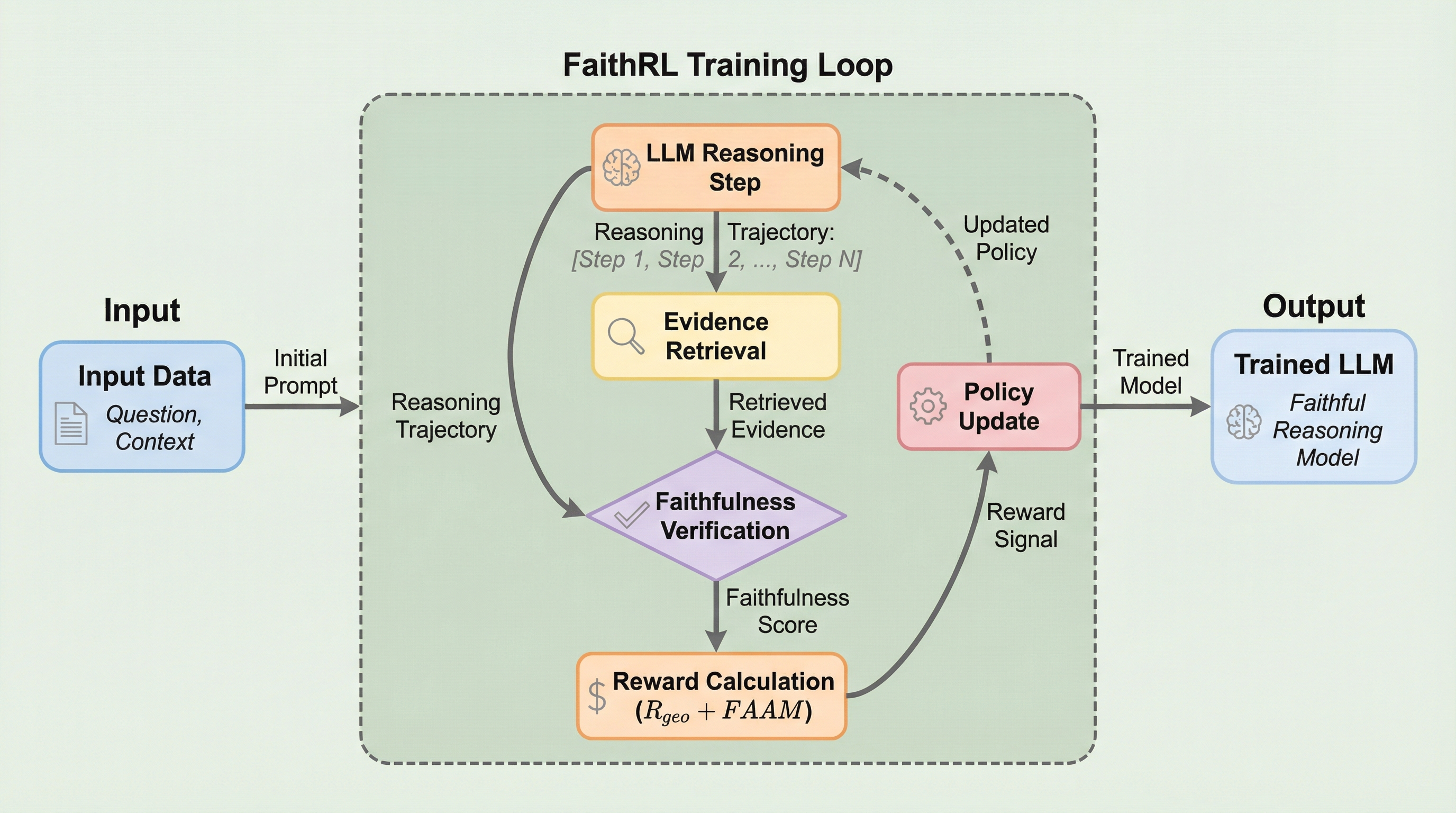 大規模言語モデルの多段階推論において、従来の最終回答のみを評価する強化学習は、論理を無視して正解を推測する過度な自信やハルシネーションを助長する課題がありましたが、本研究は推論の各ステップが証拠に基づいているかを直接評価する新しい強化学習フレームワーク「FaithRL」を提案しました。