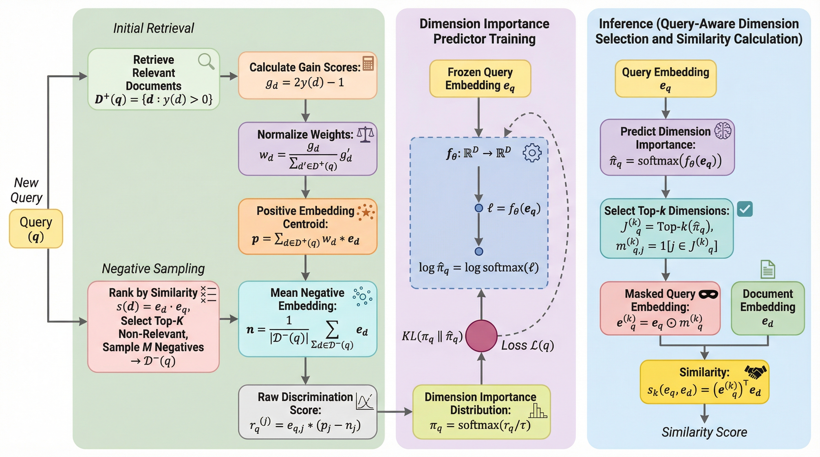 高密度検索における埋め込み表現の冗長性とノイズを排除するため、クエリごとに最適な次元を動的に選択する「クエリ適応型次元選択フレームワーク」が提案され、検索精度の向上と計算効率の両立が実証されました。