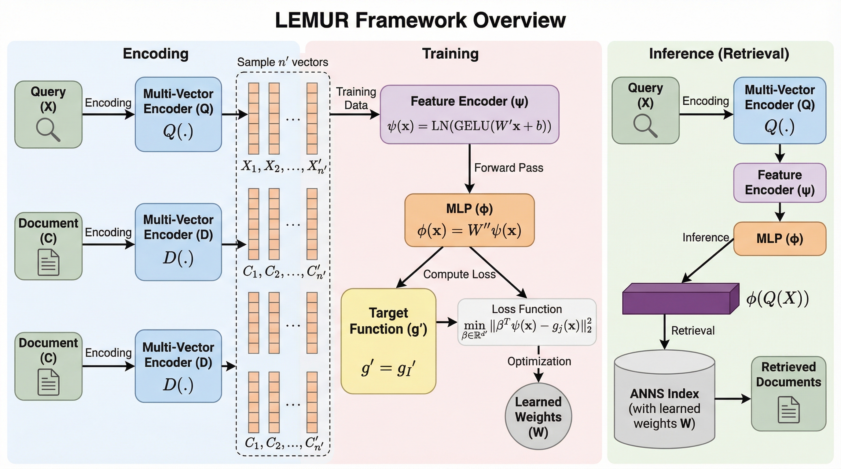 本論文では、マルチベクトル検索の効率性を劇的に向上させるためのシンプルかつ強力なフレームワークである「LEMUR(Learned Multi-Vector Retrieval)」を提案しています。LEMURの核心となるアイデアは、マルチベクトル間の類似度計算という複雑な問題を、二段階の連続的な問題変換によって簡略化することにあります。第一の変換では、クエリと各文書の間のMaxSim類似度を直接推定するタスクを、教師あり学習におけるマルチ出力回帰問題として定式化しました。…