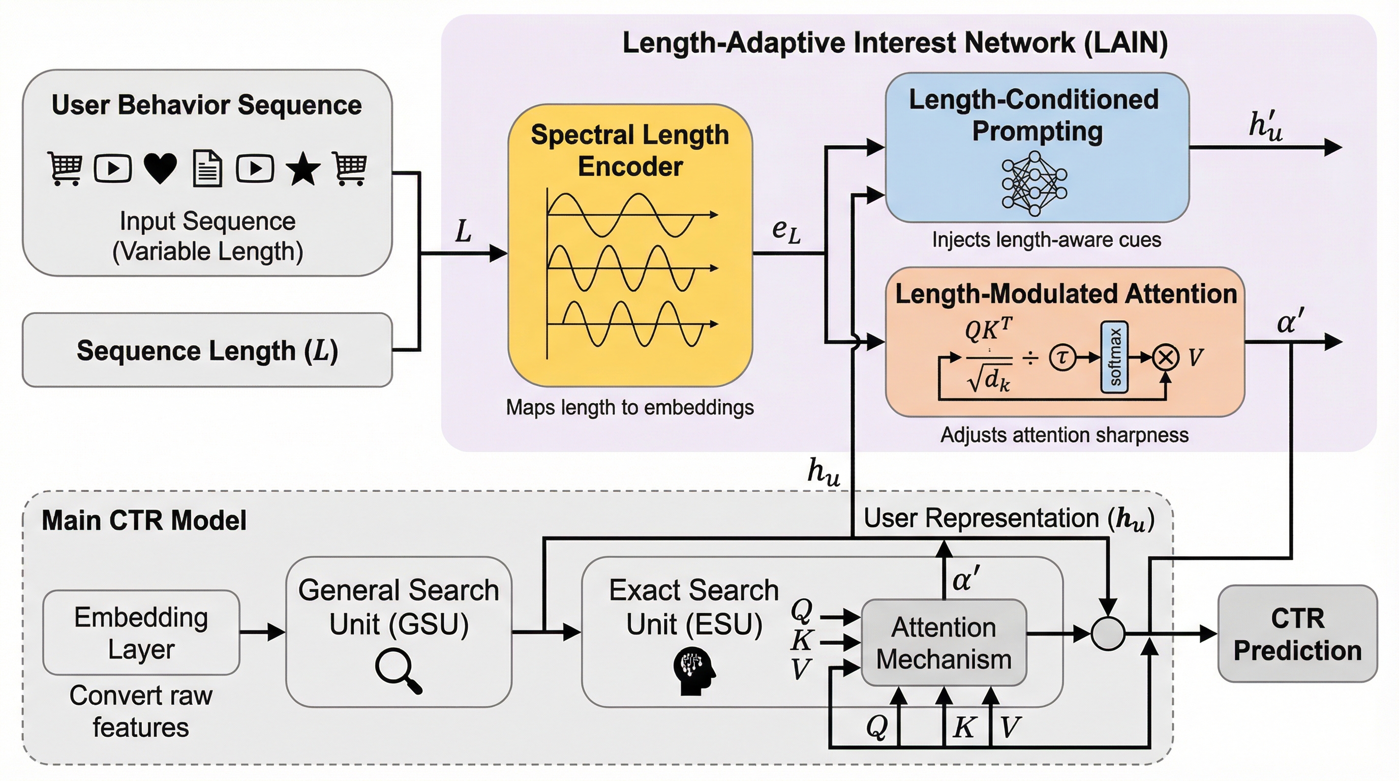 本論文では、ユーザーの行動履歴の長さを明示的な「条件信号」としてモデルに取り入れ、長短両方のシーケンスモデリングを調和させるための軽量かつ汎用的なフレームワーク「LAIN(Length-Adaptive Interest Network)」を提案している。LAINの最大の特徴は、特定のモデル構造に依存せず、既存の様々なCTR予測モデルに後付けで組み込むことが可能な「プラグアンドプレイ」な設計である点にある。このフレームワークは、モデルがユーザーの履歴の長さを単なる統計量としてではなく、ユーザーの現在のライフサイクルや興味の多様性を反映するコンテキストとして認識し、それに応じて自身の挙動を動的に変化させることを可能にする。 LAINは主に3つの軽量なコンポーネントで構成されている。…