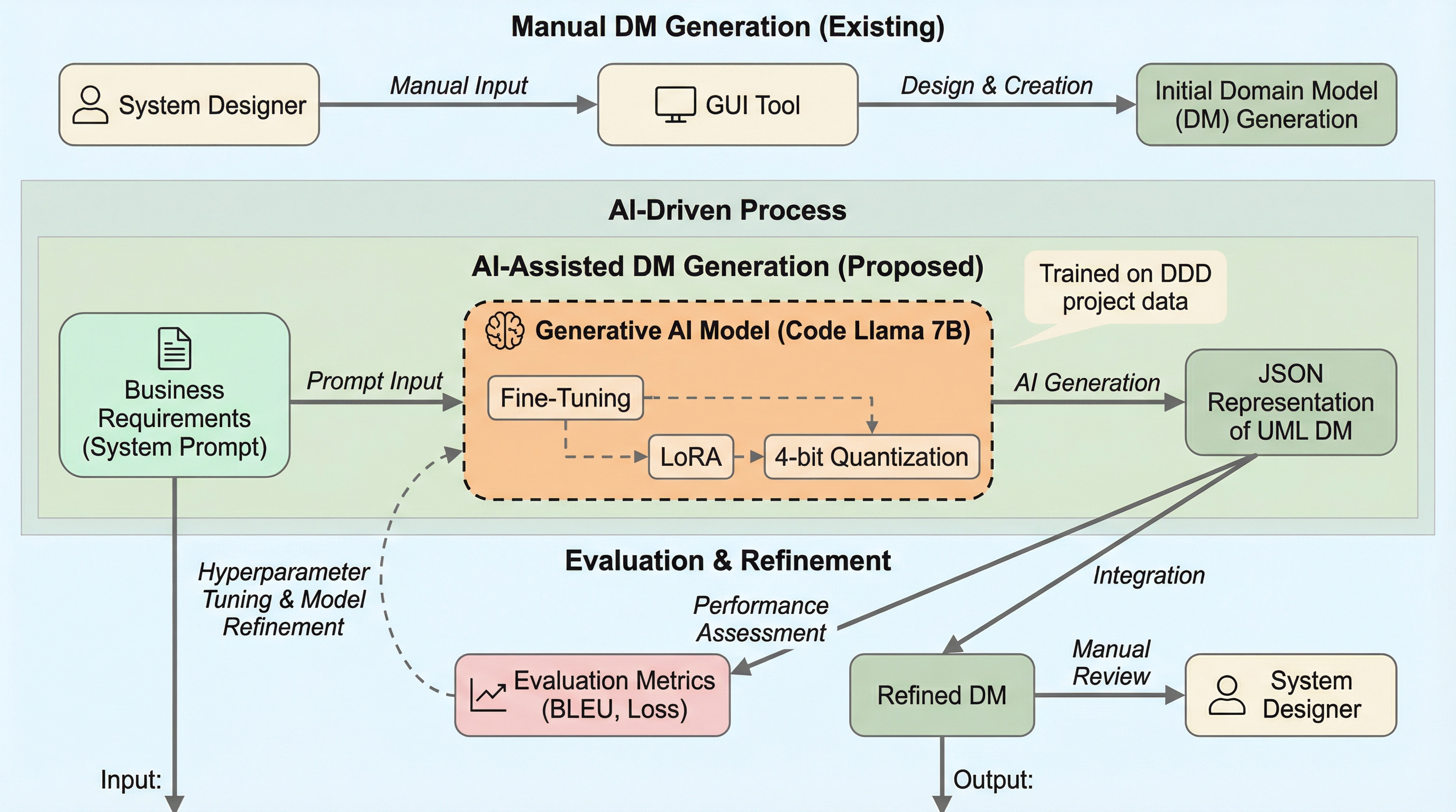 ドメイン駆動設計(DDD)におけるメタモデル作成の自動化を目指し、Code Llama 7Bを4ビット量子化とLoRAを用いて、消費者向けGPUという限られた計算資源環境下で微調整した。 実世界のプロジェクトデータを用いた学習により、単純なプロンプトから構文的に正しいJSONオブジェクトを生成することに成功し、設計プロセスの効率化とリソース削減の可能性を示した。 評価指標としてBLEUスコアと損失関数を用い、明確なプロンプトでは100%の構文的正しさを達成したが、トークン制限による繰り返しやデータ分割に起因する構造的課題も確認された。