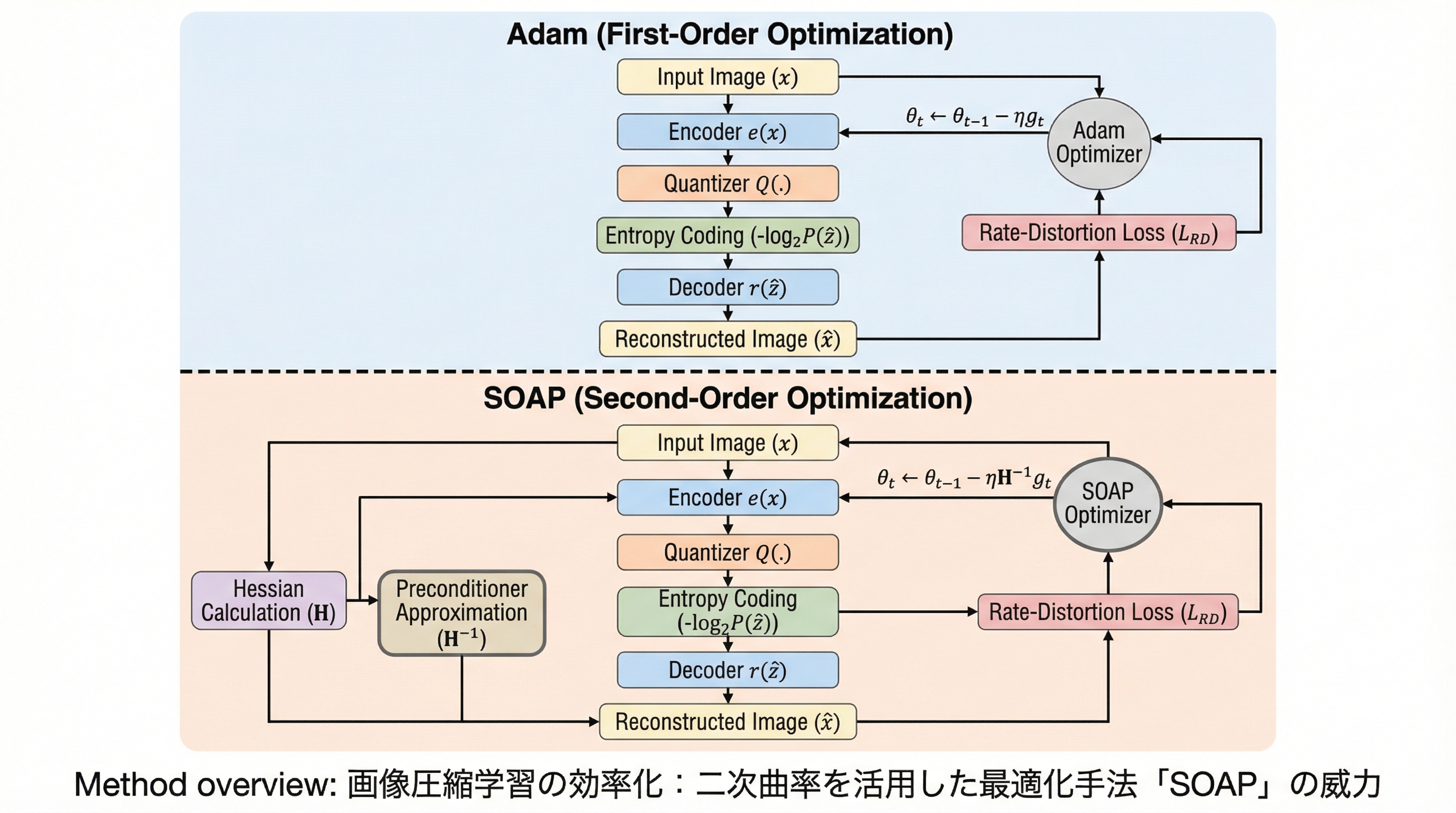 本研究の核心は、画像圧縮モデルの訓練において、従来の一次最適化手法を、二次曲率情報を効率的に活用する準ニュートン最適化手法である「SOAP」に置き換えることを提案した点にある。SOAPは、損失関数の二次導関数(ヘッセ行列)の情報を利用することで、パラメータ空間の幾何学的な構造を考慮した更新を行う。これにより、従来のAdamなどが陥っていた勾配の衝突を、数学的な裏付けを持って解消することが可能になる。特筆すべきは、この提案が「ドロップイン置換」として機能することである。つまり、モデルのアーキテクチャを変更したり、損失関数を複雑に再定義したり、あるいは訓練パイプラインに大幅な修正を加えたりすることなく、単にオプティマイザを差し替えるだけで、学習の高速化と性能向上の両方を享受できる。このアプローチは、画像圧縮におけるレート歪み最適化を、単なるスカラー値の最小化ではなく、多目的最適化の観点から捉え直している。…