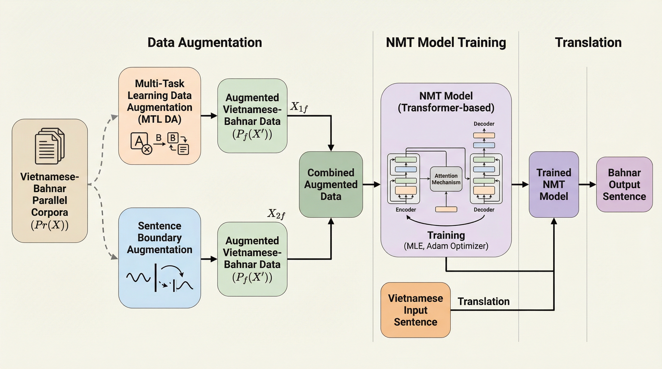ベトナムの少数民族であるバナ族の言語を保護し、デジタル化を促進するため、限られた学習データでも高精度な翻訳を可能にするニューラル機械翻訳(NMT)技術が開発されました。 本研究では、既存の並列コーパスのみを活用し、複雑な前処理や追加データを必要としない「マルチタスク学習データ拡張(MTL DA)」と「文境界拡張」という2つの柔軟な手法を提案しています。 これらの手法は、バナ語特有の複雑な語彙構造やベトナム語との文法的な差異に起因する誤訳を大幅に改善し、文化遺産の継承と世代間コミュニケーションの活性化に大きく貢献する実用的な成果を示しました。