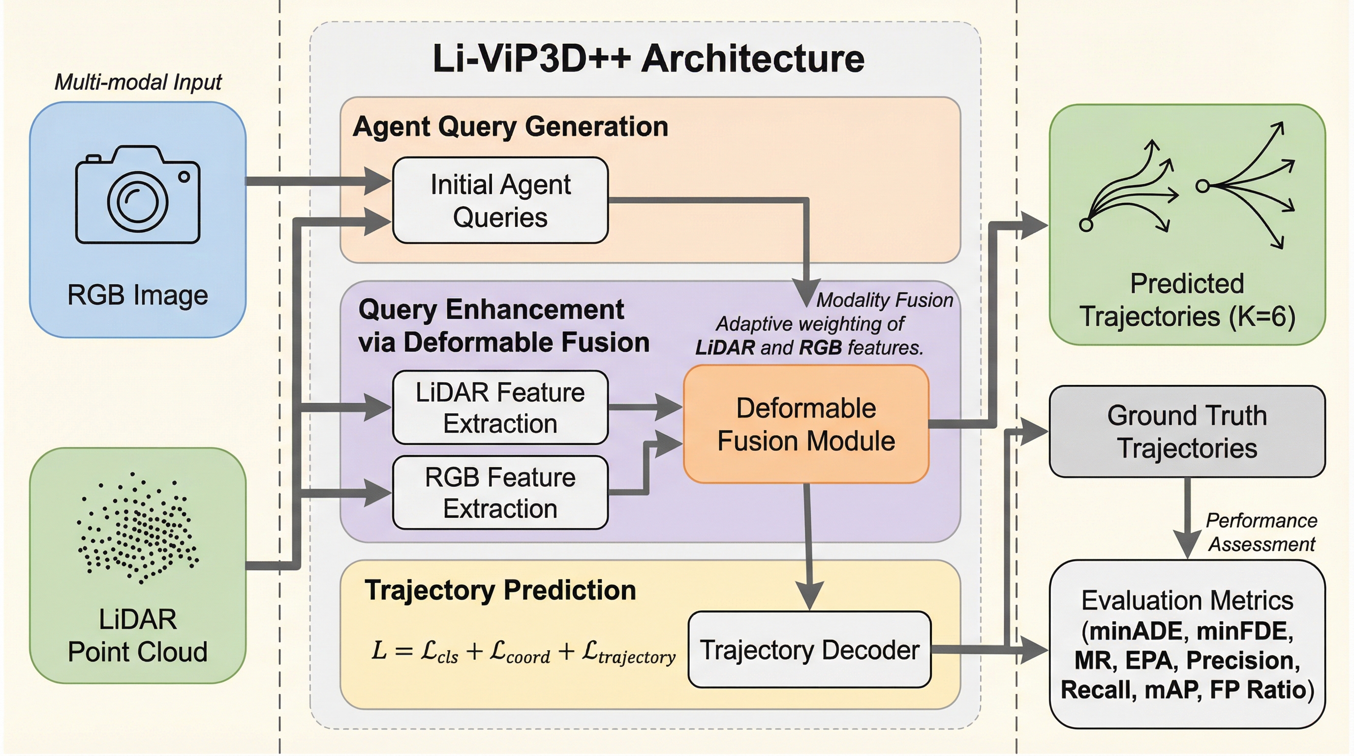 Li-ViP3D++は、自動運転における物体認識と軌跡予測を統合するエンドツーエンドのフレームワークであり、カメラとLiDARの情報をクエリ空間で融合するQuery-Gated Deformable Fusion(QGDF)を導入しています。