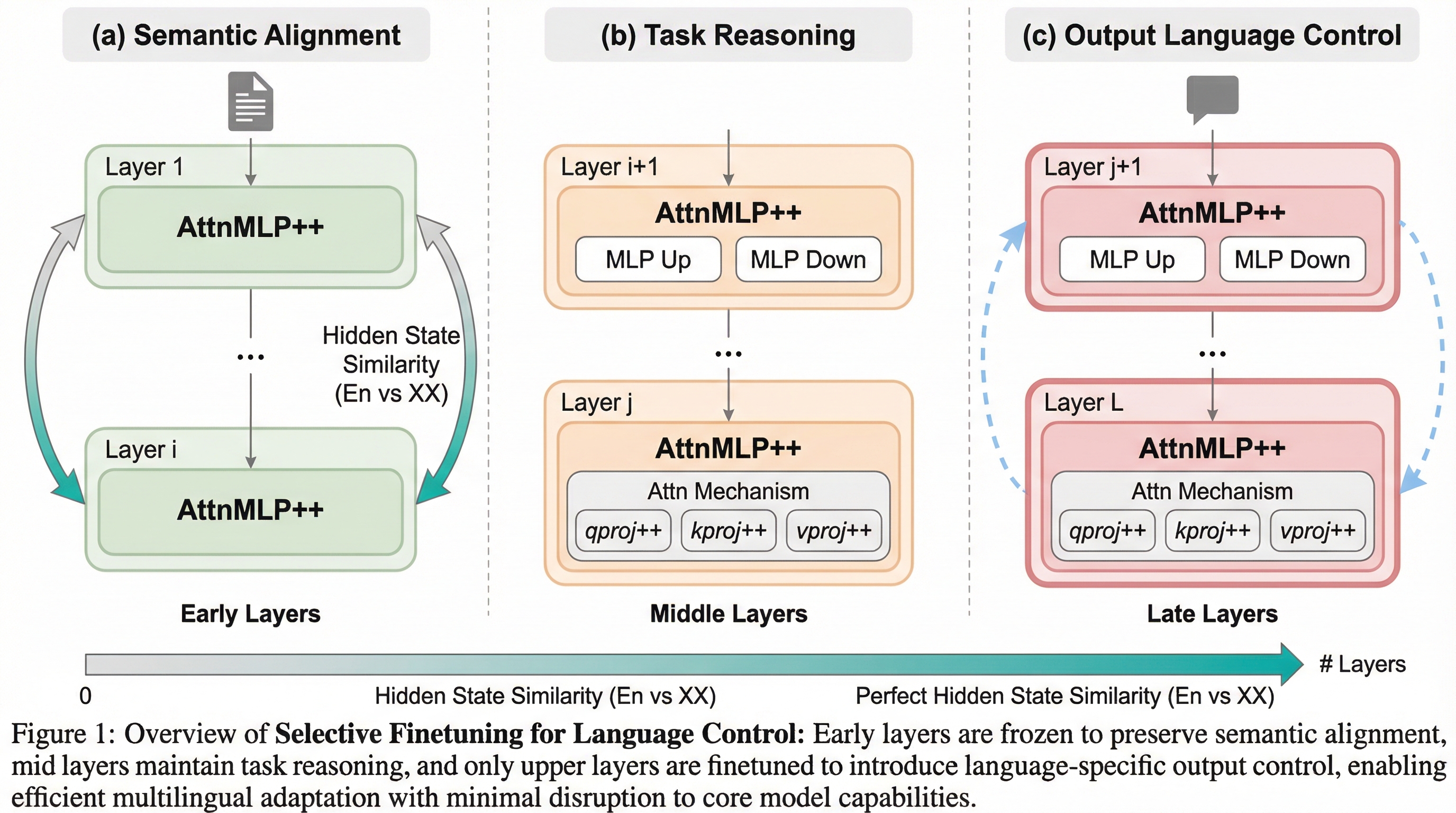 多言語大規模言語モデルが直面する「回答は正しいが出力言語を誤る」という言語一貫性の欠如と、「言語は正しいがタスクに失敗する」という多言語転送の停滞という二つの主要なボトルネックを特定し、モデル内部の層が「初期の意味整合」「中間のタスク推論」「終盤の言語制御」という明確な三段階の機能構造を持つことを解明しました。 この内部構造の知見に基づき、モデル全体のパラメータを更新するのではなく、言語出力を司る最終盤のわずか3パーセントから5パーセントの層のみを対象とする「選択的微調整」という極めて効率的な手法を提案し、計算資源を大幅に節約しながら特定の言語環境への適応を可能にする新しいアプローチを確立しました。 Qwen-3-32BやBloom-7.1Bを用いた検証において、タスクの推論精度を一切損なうことなく、混合言語プロンプトなどの困難な条件下でも98パーセント以上の極めて高い言語一貫性を達成し、全パラメータを微調整する従来手法と同等の効果を最小限のコストで実現できることを実証しました。