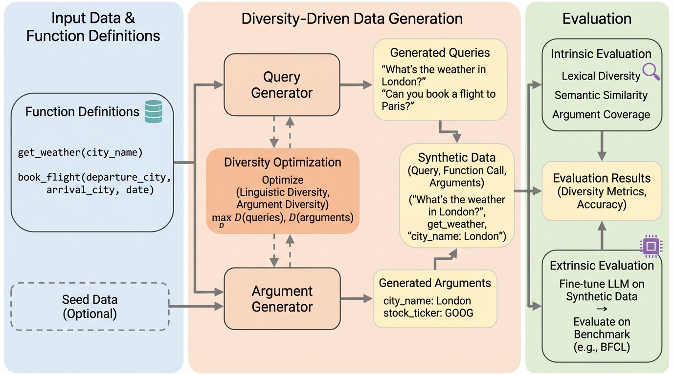 関数呼び出しエージェントの学習には多様なデータが不可欠ですが、既存手法は関数の種類や呼び出しパターンに偏り、ユーザーの言い回しの多様性(言語的多様性)や引数の値の網羅性(引数の多様性)が不足しているという課題がありました。