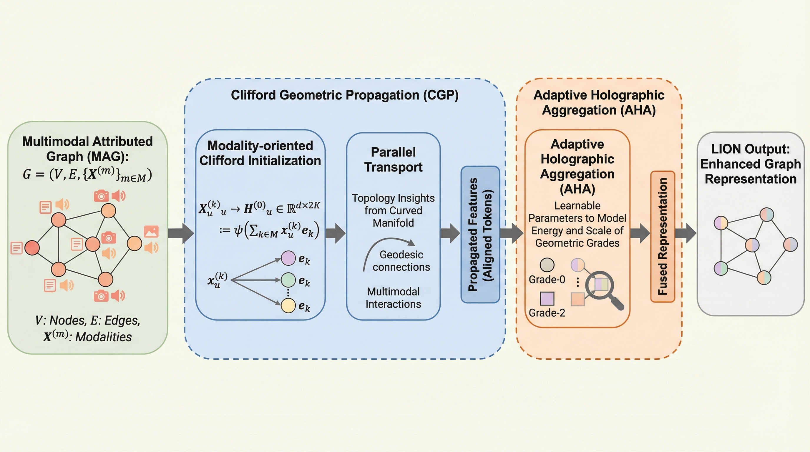 LIONは、マルチモーダル属性グラフ(MAG)におけるモダリティの整列と融合の課題を解決するために、クリフォード代数を導入した新しい神経パラダイムである。従来のグラフ機械学習手法がグラフの文脈を無視した整列や、トポロジーの事前知識を十分に活用できない融合に陥っていたのに対し、本手法は幾何学的な多様体上での伝播と集約を分離して実行することで、高次の相互作用を捉える。9つのデータセットを用いた広範な実験により、グラフ関連タスクで平均5.24%、モダリティ関連タスクで平均7.68%の精度向上を達成し、数学的な安定性と収束性の証明により、理論的な堅牢性と最先端の性能を実証している。