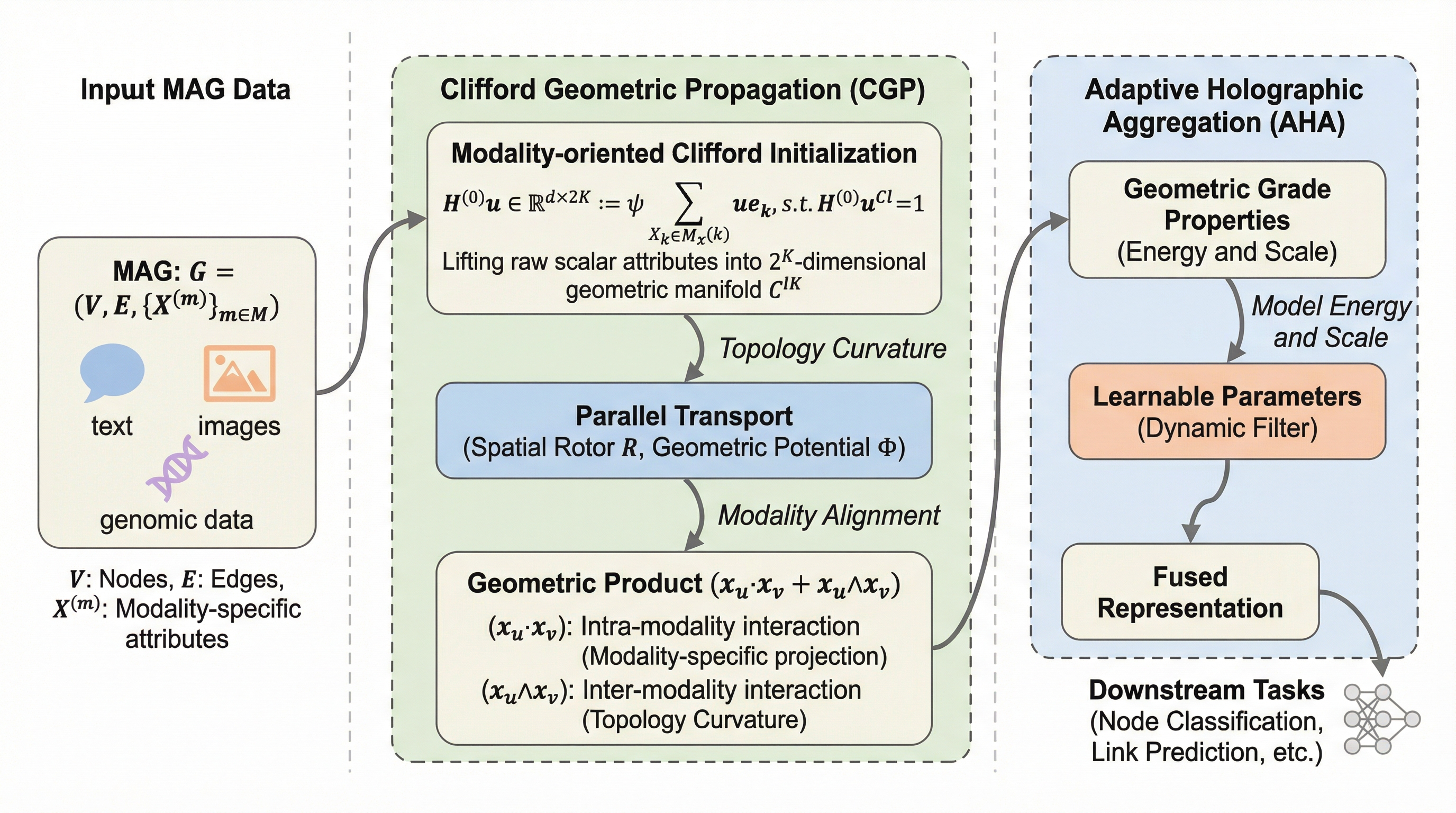 マルチモーダル属性グラフ(MAG)におけるモダリティ間の整列不全と融合の適応性不足を解消するため、クリフォード代数に基づく新しい神経パラダイム「LION」を提案しました。 幾何学的多様体上での高次グラフ伝播(CGP)により、グラフの広域な文脈を考慮した効率的なモダリティ整列を実現し、従来の1ホップ制限やモダリティ固有の制約を数学的に克服しています。 整列済みトークンの幾何学的グレード特性を活用する適応型ホログラフィック集約(AHA)を導入し、エネルギーとスケールに基づく動的なフィルタリングを通じて、9つのデータセットと6つの下流タスクで最高水準の性能を達成しました。