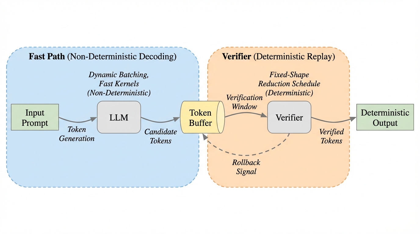 本研究では、投機的デコーディングの概念を決定性の確保に応用した新しいスケジューリング手法「LLM-42」を提案する。LLM-42の核心は、トークンの生成プロセスと決定性の検証プロセスを分離し、デコード・検証・ロールバックというプロトコルを導入した点にある。具体的には、まず「高速パス」において、標準的な非決定論的カーネルを用いてトークンを迅速に生成する。この段階では動的バッチ処理による高いスループットを維持しつつ、生成されたトークンは暫定的な候補として扱われる。 次に、一定のウィンドウサイズごとに「検証器」がこれらの候補トークンを再実行し、実行時の一貫性が保たれているかを確認する。…