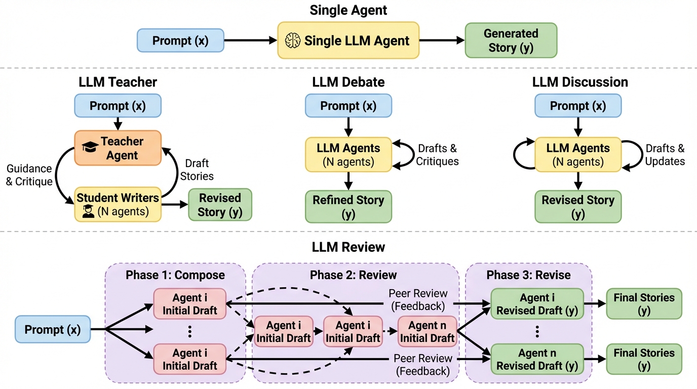 創作では相互作用を増やすほど良くなるとは限らず、エージェント同士が互いの出力に引っ張られて内容が似通う「均質化」が起き得るため、情報の流れそのものを設計対象として扱う必要があります。 / LLM Reviewは、複数エージェントがまず独立に初稿を書き、その後に他者の初稿へ狙いを定めた批評だけを返しつつ、改稿では他者の改稿結果を見せない「ブラインド・ピアレビュー」型の反復を行います。 / サイエンスフィクション短編用データセットSciFi-100と、採点モデルによる評価・人手注釈・規則ベース新規性指標を組み合わせた検証で、提案枠組みが複数のマルチエージェント基準法より一貫して良い結果を示し、相互作用の構造がモデル規模を一部代替し得ることが示唆されます。