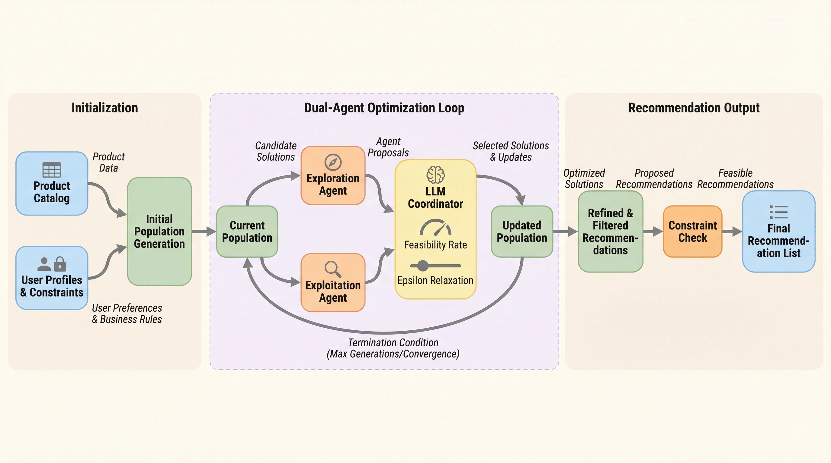 本研究は、LLMを最適化の調整役として活用する二重エージェント・フレームワーク「DualAgent-Rec」を提案しました。このフレームワークの最大の特徴は、推薦タスクを「活用(Exploitation)」と「探索(Exploration)」という二つの専門的な役割に分離し、それらをLLMが動的に統制する点にあります。具体的には、厳格なビジネス制約を遵守しながら精度の高い解を洗練させる「活用エージェント」と、制約を一時的に無視して目的関数空間の未知の領域を広く探索する「探索エージェント」を並行して走らせます。これにより、制約を満たすことだけに固執して局所解に陥るのを防ぎつつ、最終的には必ず制約を満たす高品質な推薦リストを生成することが可能になります。…