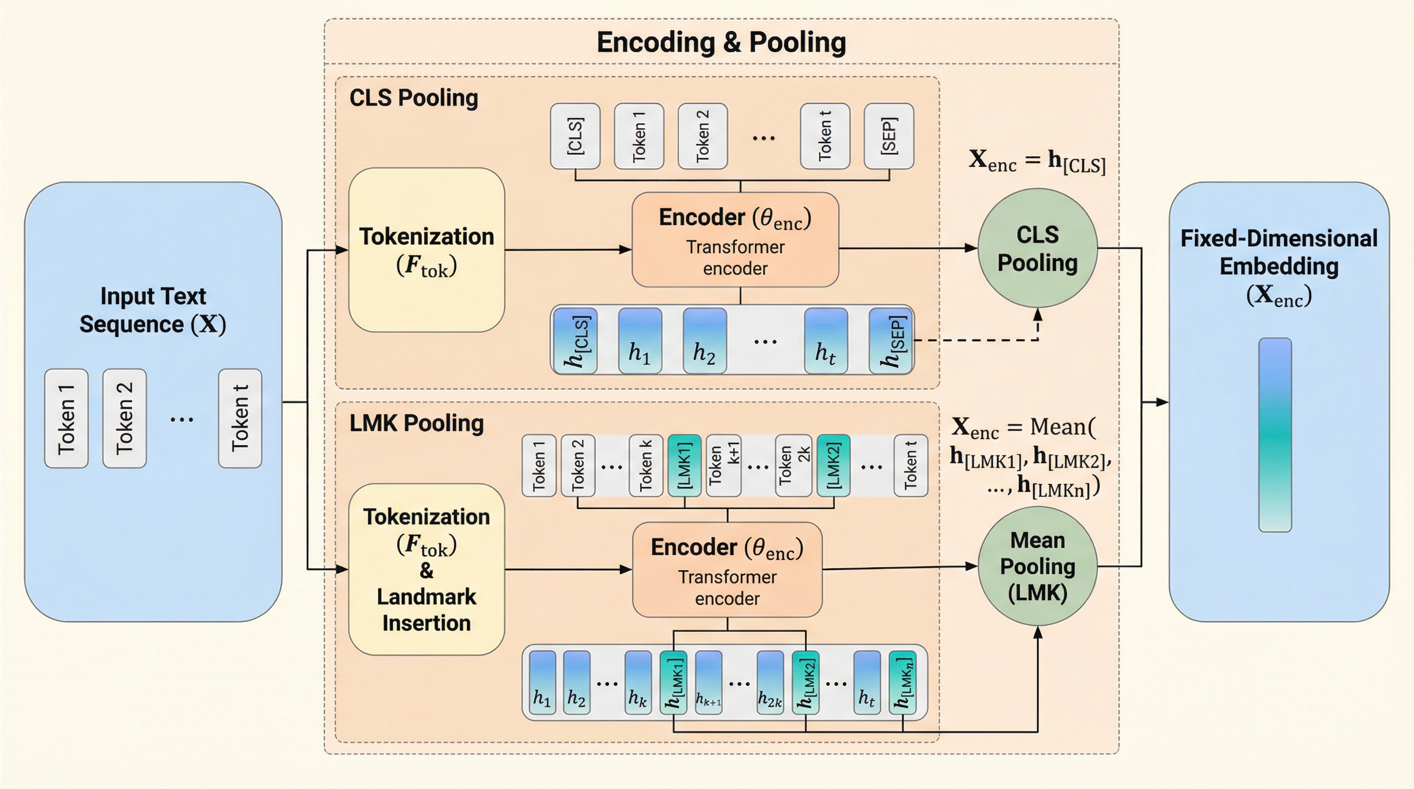 本論文では、既存のプーリング手法の限界を打破するために、シンプルながらも強力な「ランドマーク(LMK)プーリング」という手法を提案している。 この手法の核心は、入力系列の全体にわたって複数の特殊な「ランドマークトークン」を等間隔または戦略的な位置に配置し、最終的な文書表現をこれらのランドマークトークンの埋め込みのみを平均化することで構築する点にある。 具体的には、入力テキストを複数のチャンクに分割し、各チャンクの末尾にランドマークトークンを挿入する。 ランドマークトークンとしては、既存の[SEP]トークンや[EOS]トークンを流用することが可能であり、新たな語彙を追加する必要がない。…