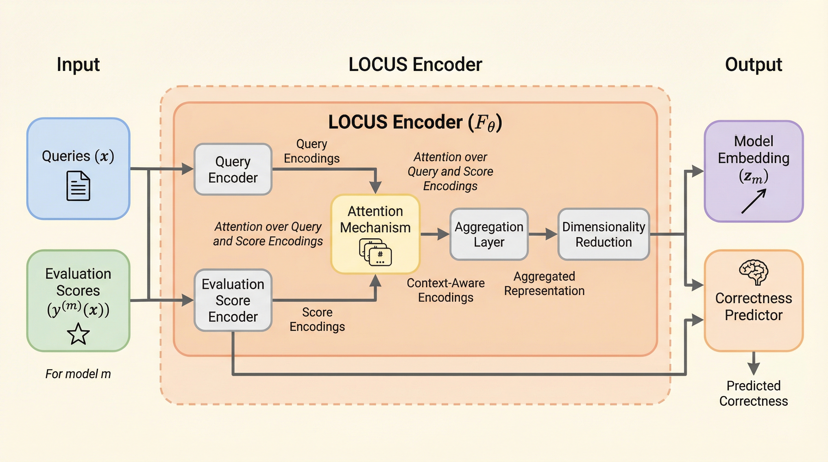 本論文では、モデルの能力を理解するための低次元埋め込み手法である「LOCUS(LOw-dimensional embeddings for Model Capability UnderStanding)」を提案している。LOCUSの核心は、モデルが特定のクエリに対して示したパフォーマンス(正解・不正解などのスコア)の集合を、アテンション機構を用いたエンコーダによって固定次元のベクトルに変換する点にある。このベクトルは「モデル埋め込み」と呼ばれ、そのモデルの広範な能力プロファイルをコンパクトに要約したものとして機能する。LOCUSは、主に2つのコンポーネントで構成されている。1つ目は、クエリのエンコーディングと評価スコアを入力として受け取り、モデル埋め込みを生成するアテンションベースのエンコーダである。…